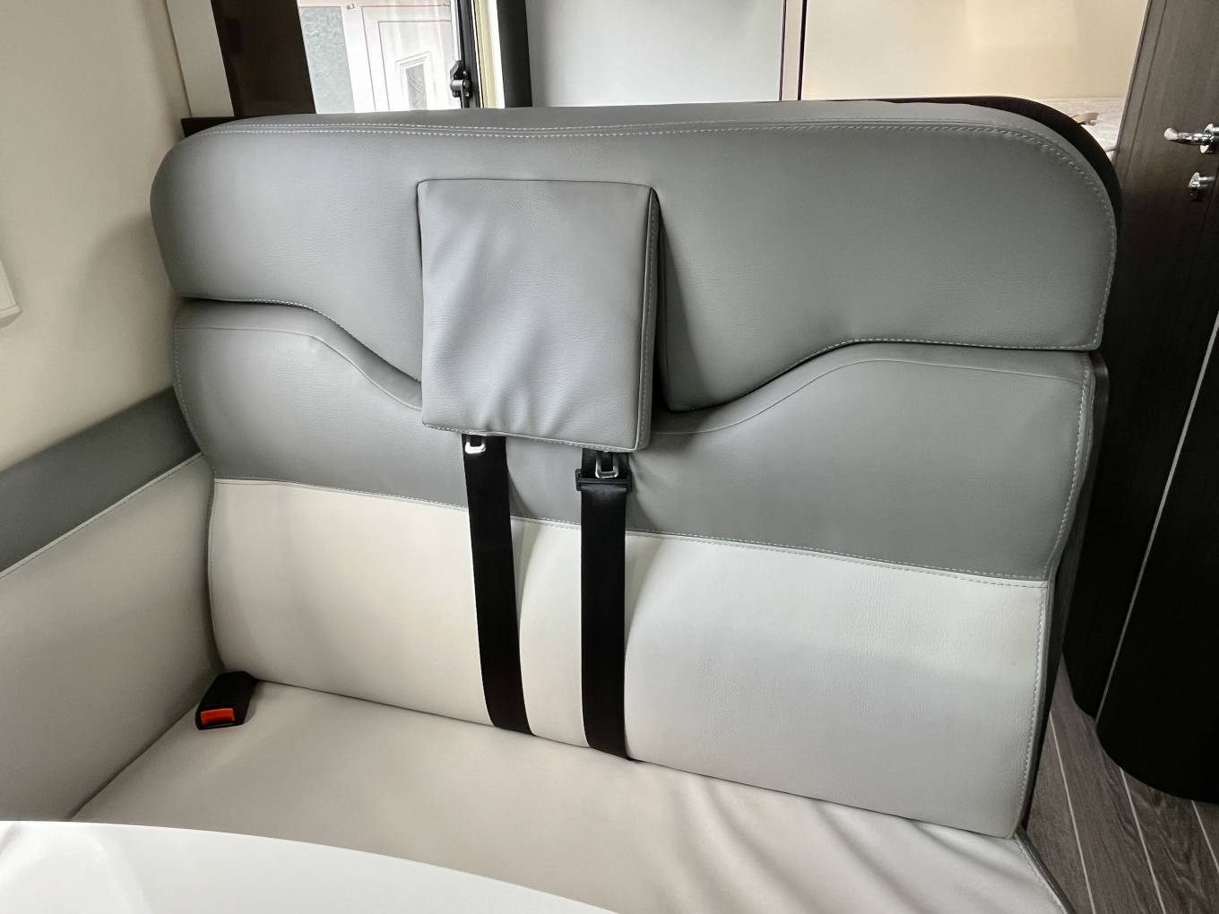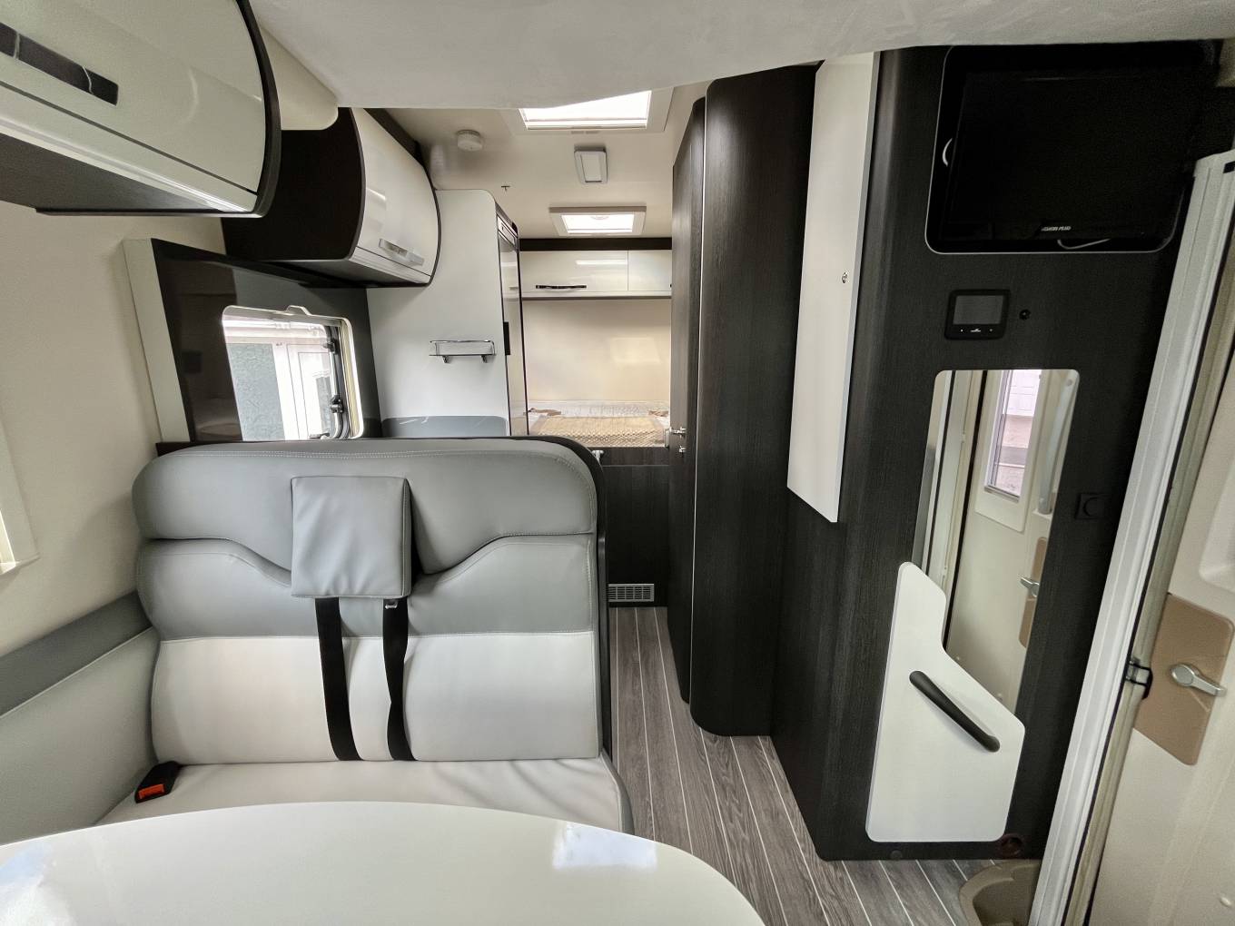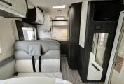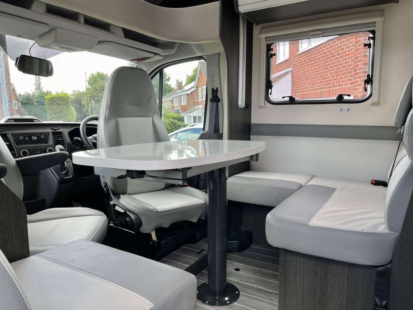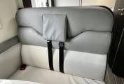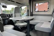 In the Ford cab you will see the Automatic gearbox, (mated to the Ford 2.0L 130 Bhp engine), cruise control, cab air conditioning and the two swiveling captains seats, there are also cab silver screens supplied with the van, to the rear of this is the dinette and socialising space with a large table and two additional traveling seats and belts, above this area is a good sized electric drop down bed