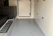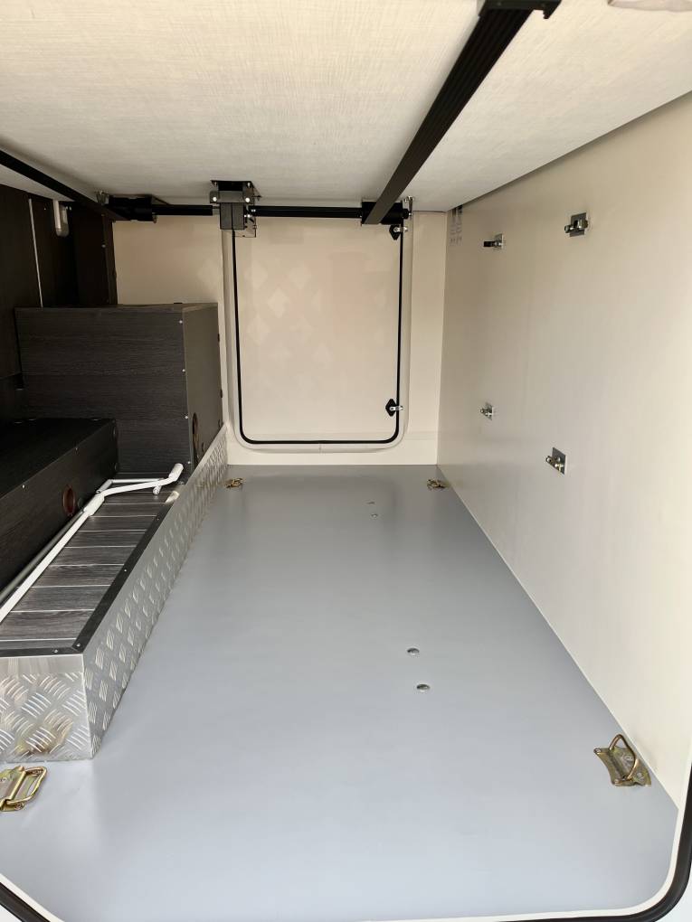 As we look to the outside we see a stylish Ford cab leading into the rear habitation unit, you will notice the black and silver 5 spoke alloy wheels, wind out Fiamma canopy awning, (on the roof we have a 120W solar panel), habitation door, secure gas locker and toilet cassette locker and to the rear a large garage access door, look inside to see the large garage space complete with interior light and socket. To the rear of the van we have the rear camera, a 4 cycle bike rack and rear parking sensors, on the off side we have a second smaller access door to the large garage, once opened you will see the bed height adjusting mechanism and winder, back to the exterior you will see the hookup socket and fresh water filler, to the underneath of the van is a full sized spare wheel and carrier.