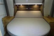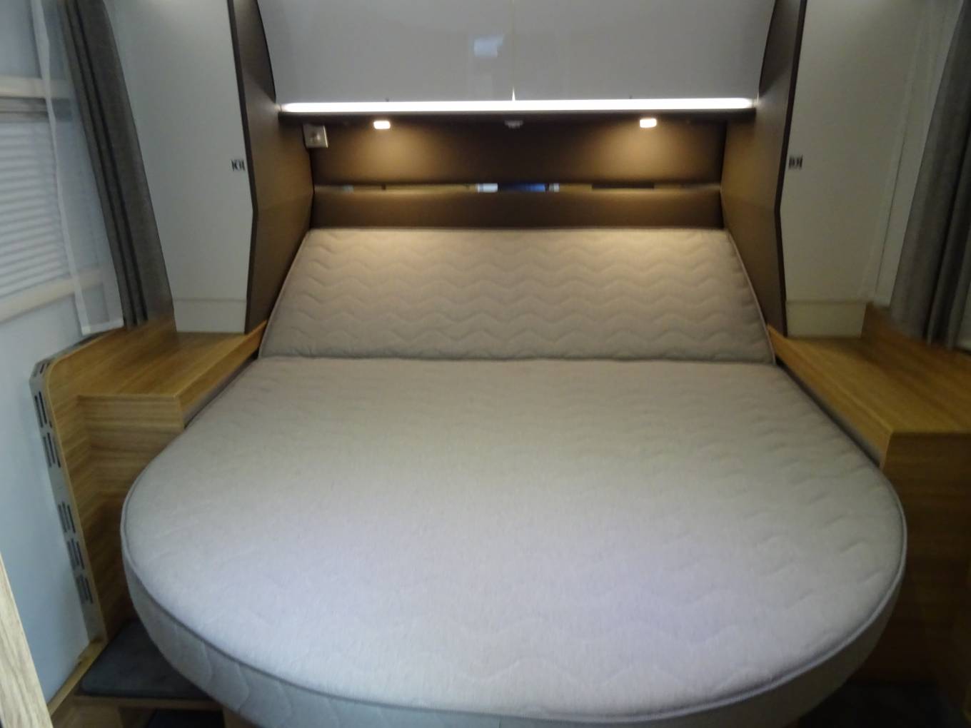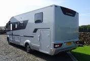 The layout comprises overcab electric drop-down double bed; large central lounge, which can comfortably seat 5; dining area; well-appointed central kitchen; separate toilet and washroom with shower room across the hall. A short walk to the rear accommodation, which can be closed off with a door from the front half of the motorhome, comprises the rear bedroom featuring a large fixed central island bed which sits over the rear garage.