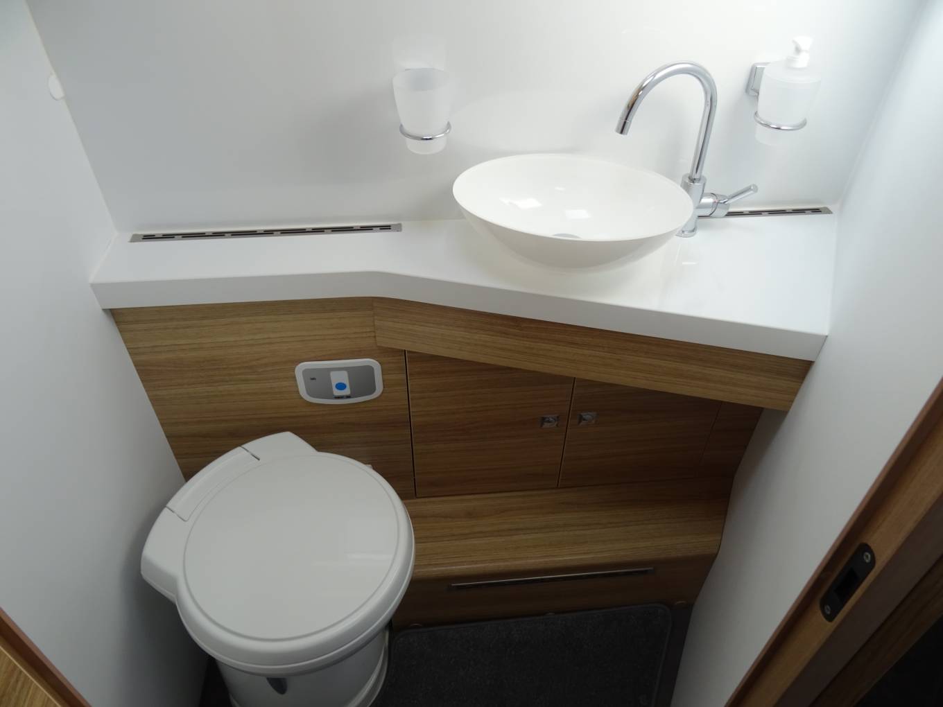 Washroom - electric flush cassette toilet and sink. Separate shower enclosure across the
