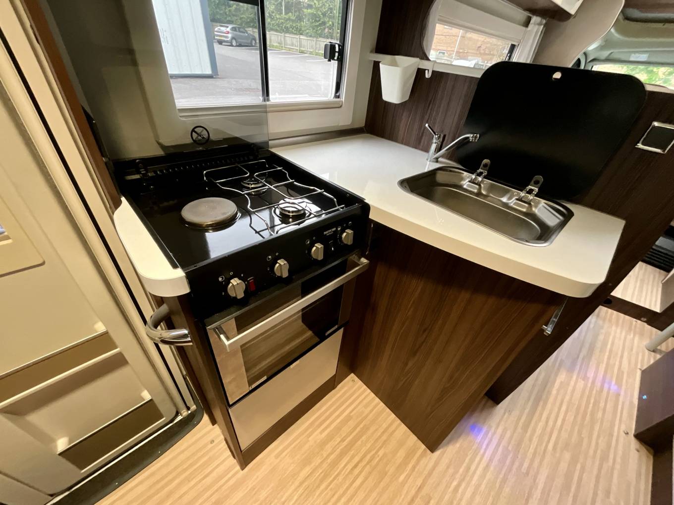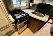 Towards the rear, a well equipped kitchen includes a Thetford oven and grill, gas hobs, microwave, fridge with freezer, tap with sink, and plenty of storage for crockery, condiments and cutlery.