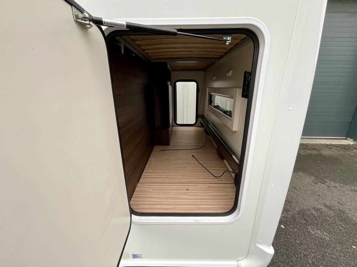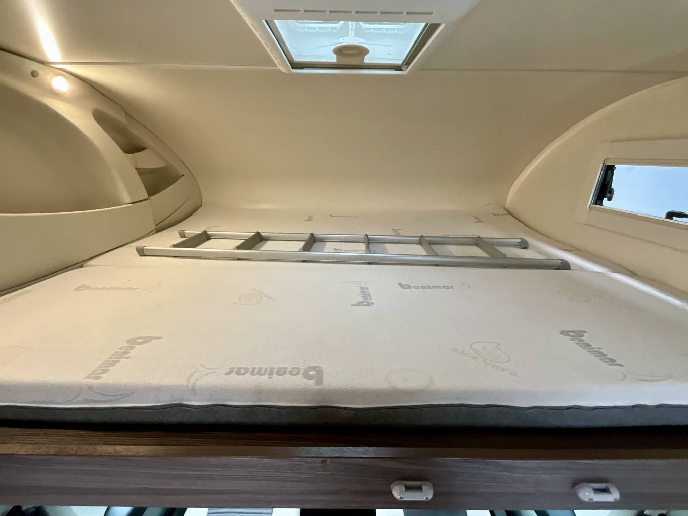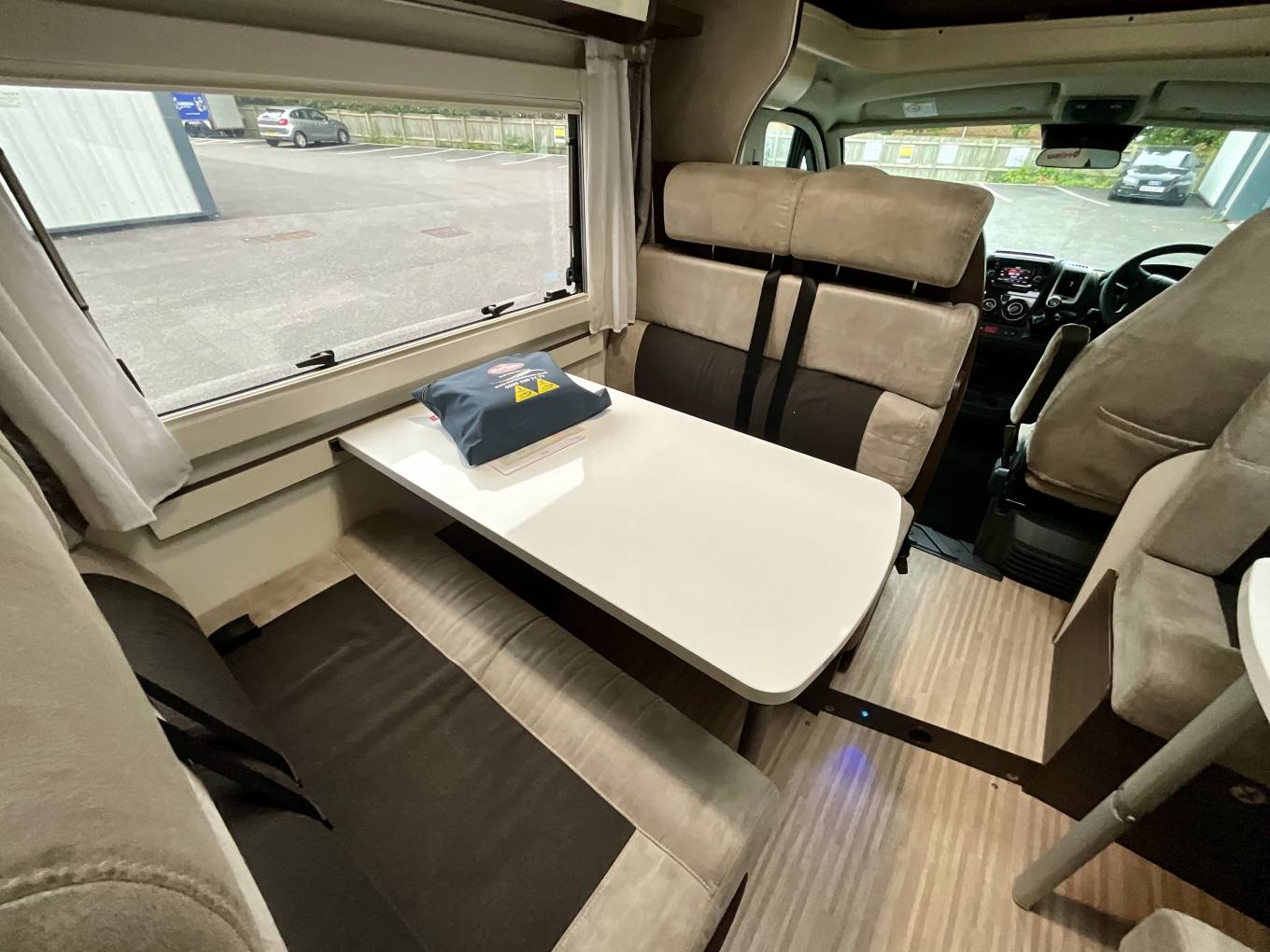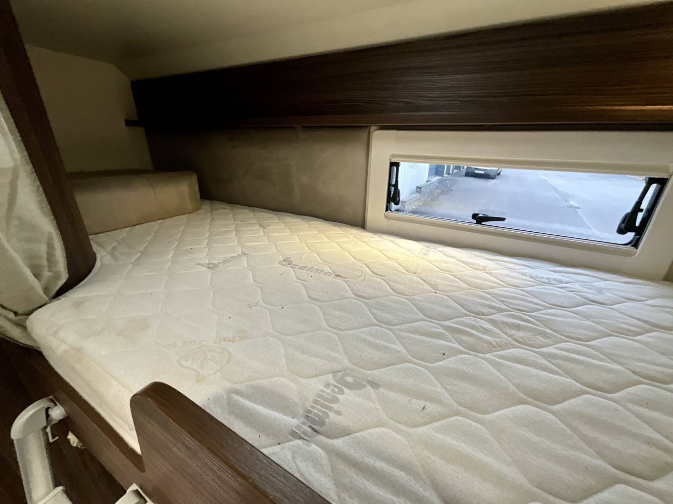 Featuring a spacious overcab bed measuring 2.05 metres by 1.55 metres, and the rear bunks are 2.10 metres by 0.80 metres. The central dinette can also be made up into a lovely 1.67 metres by 1.33 metres bed. The rear lower bunk can be lifted to allow for a full garage space at the back, maximising the room for storage in this adaptable motorhome. All of the motorhome is kept warm with a Truma dual fuel heating system and boiler.