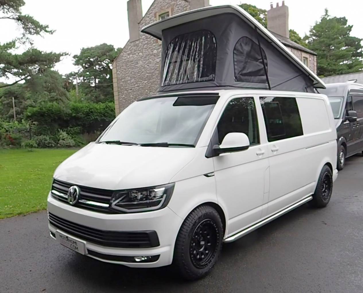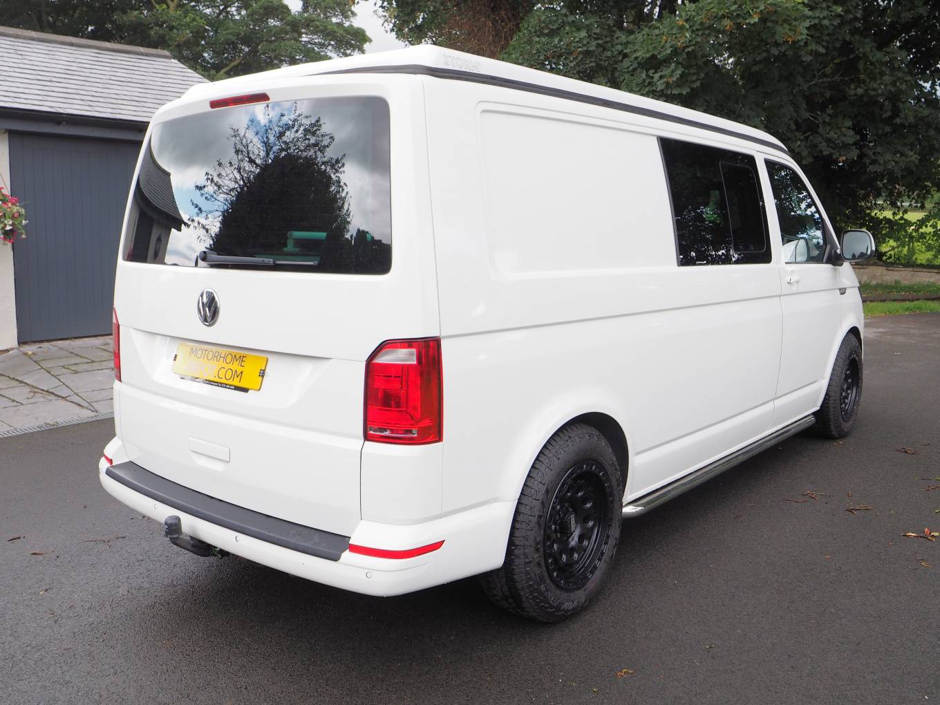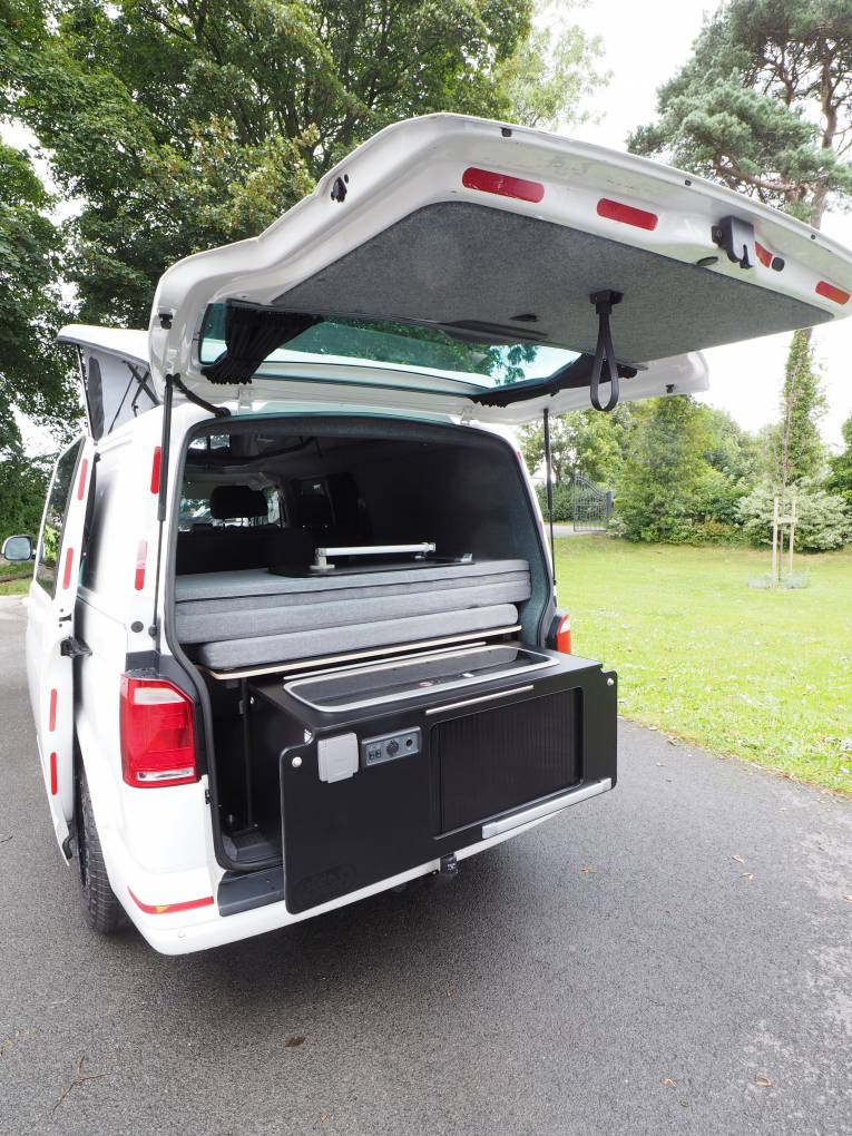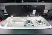 Fitted with a Storm pop top roof with bedboard and scenic canvas giving plenty of headroom. A rear Slide Pod kitchen unit provides a 2 burner gas hob and sink with tap, storage, 12v and USB sockets and plug in shower point. A full width double bed with fold out mattress is fitted to the rear. The 3 seat bench seat with 3 travel belts has a reversible rear back rest. Externally there is a tow bar with 7 pin electrics.