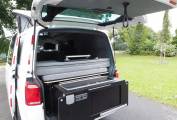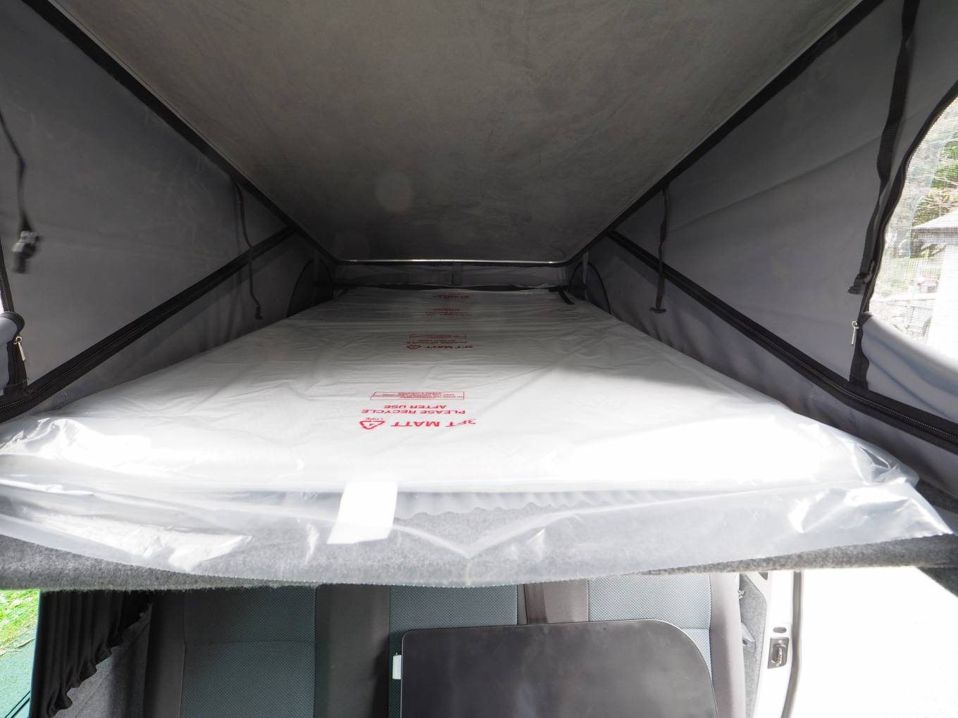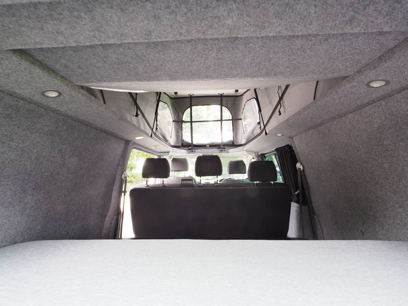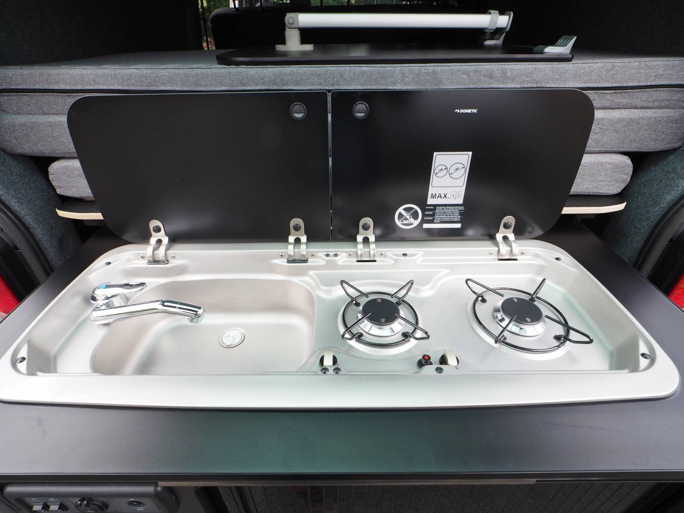Fitted with a Storm pop top roof with bedboard and scenic canvas giving plenty of headroom. A rear Slide Pod kitchen unit provides a 2 burner gas hob and sink with tap, storage, 12v and USB sockets and plug in shower point. A full width double bed with fold out mattress is fitted to the rear. The 3 seat bench seat with 3 travel belts has a reversible rear back rest. Externally there is a tow bar with 7 pin electrics.