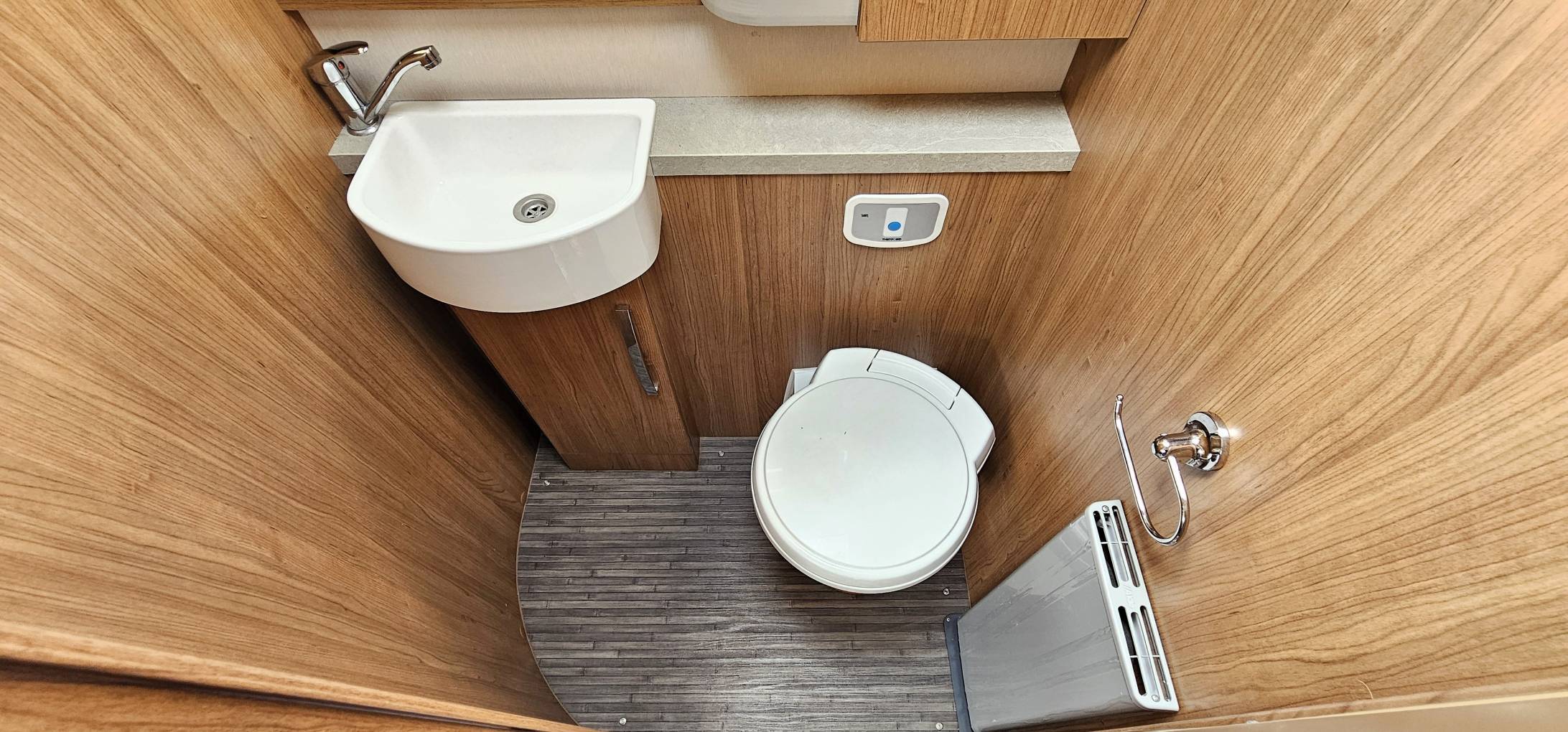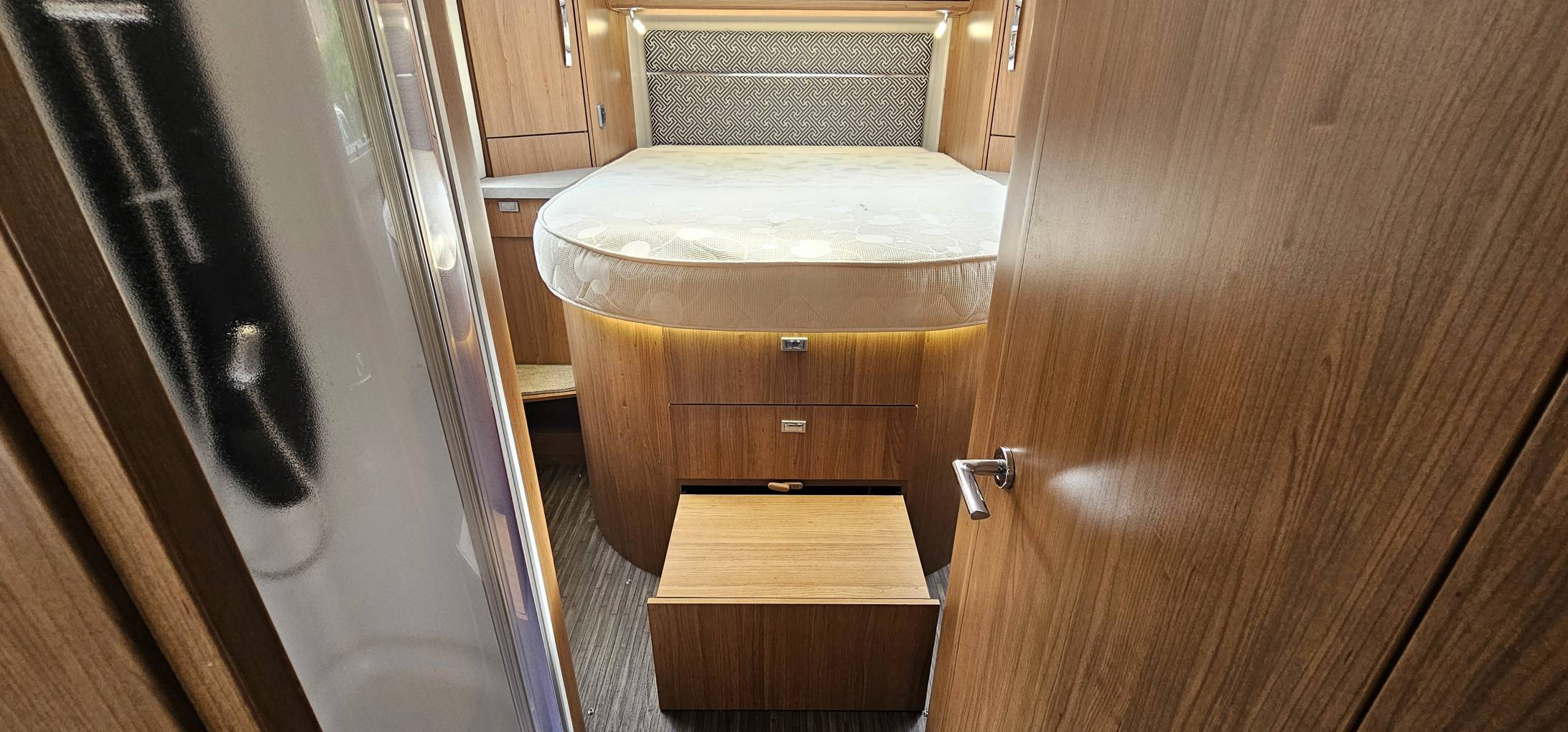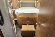 Designed with both comfort and practicality in mind, this tag axle motorhome features a spacious garage for all your storage needs and a luxurious rear fixed island bed with easy access from both sides. The cleverly designed bathroom includes a toilet and sink on one side and a separate shower cubicle on the other, with a door to create a private ensuite area.