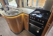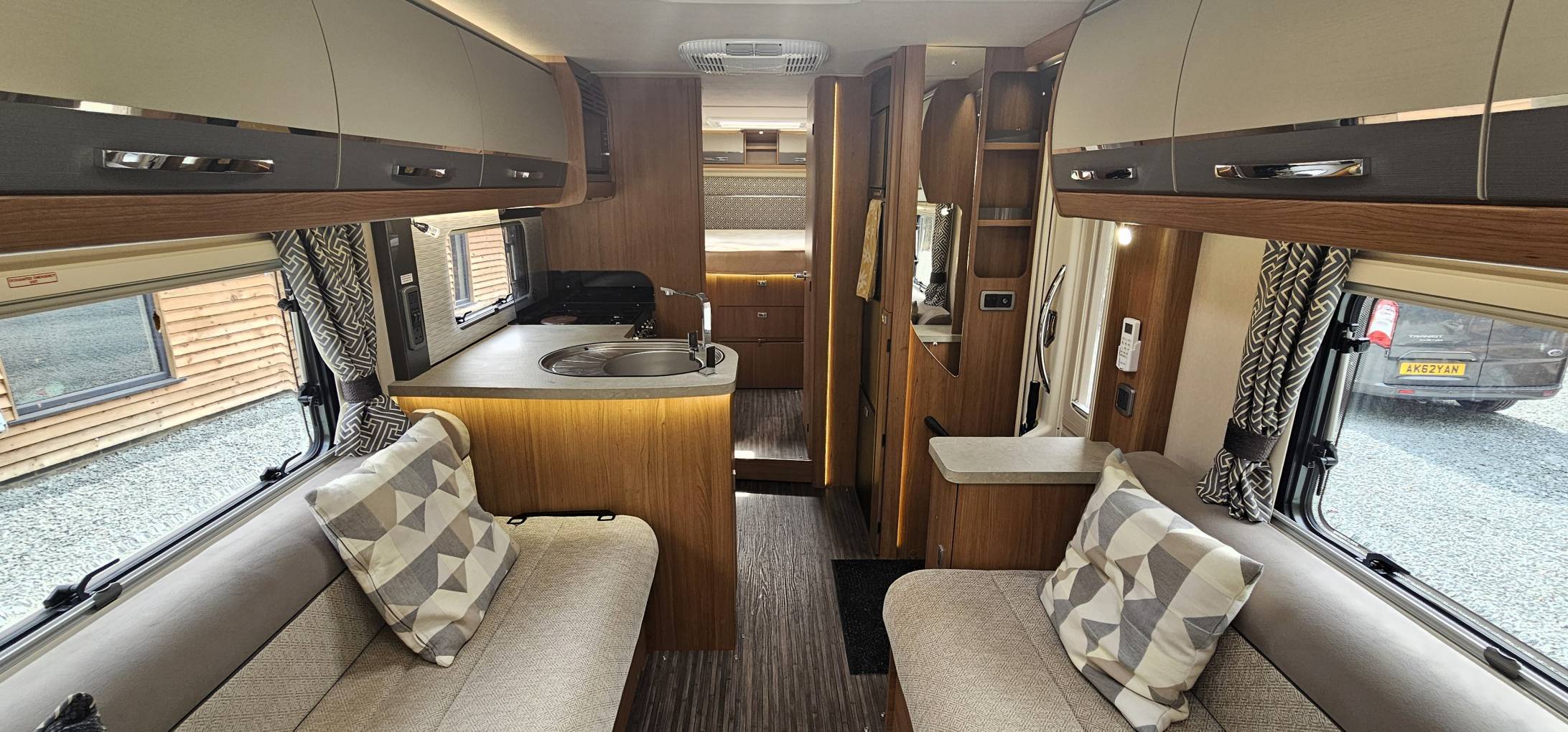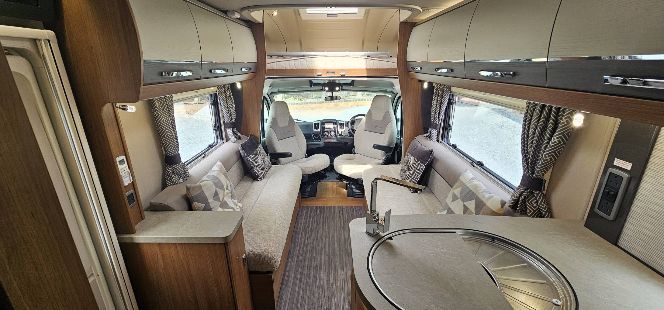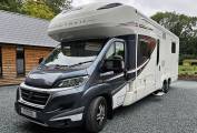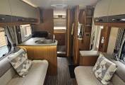 The open-plan kitchen and living space creates an airy, inviting atmosphere, featuring two large bench seats and two captain’s chairs, perfect for socializing or relaxing. Whether you're heading out on short trips or long adventures, this 6-berth motorhome offers the ultimate combination of style, space, and convenience.
