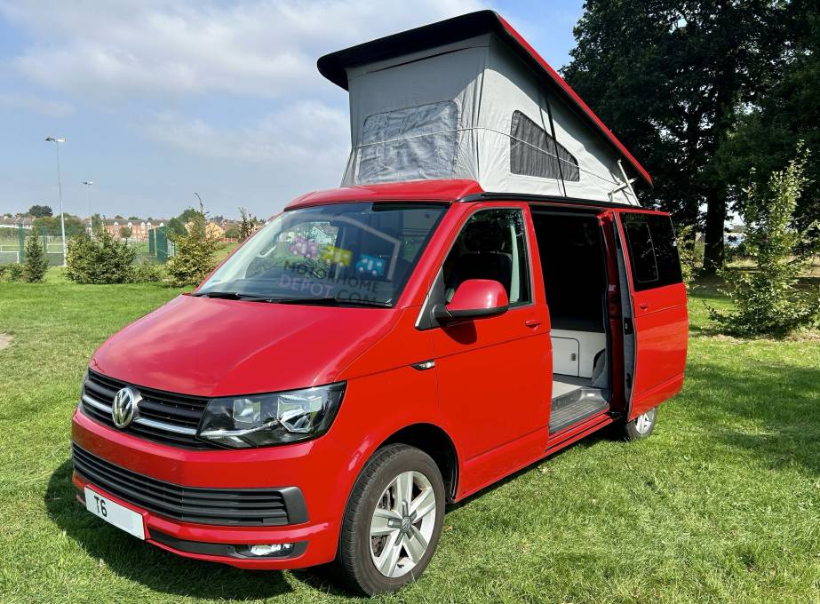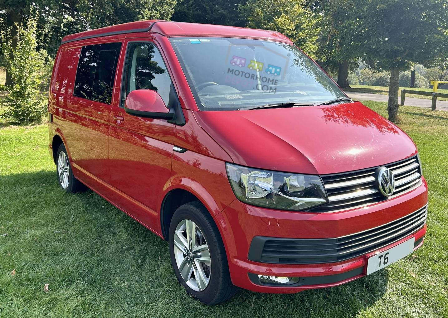 Motorhome Depot Derbyshire and South Yorkshire proudly presents this impressive 2017 Volkswagen T6 Highline in the desirable cherry red with colour coded bumpers and pop top and an extensive service record. This vehicle is located in Nottinghamshire.