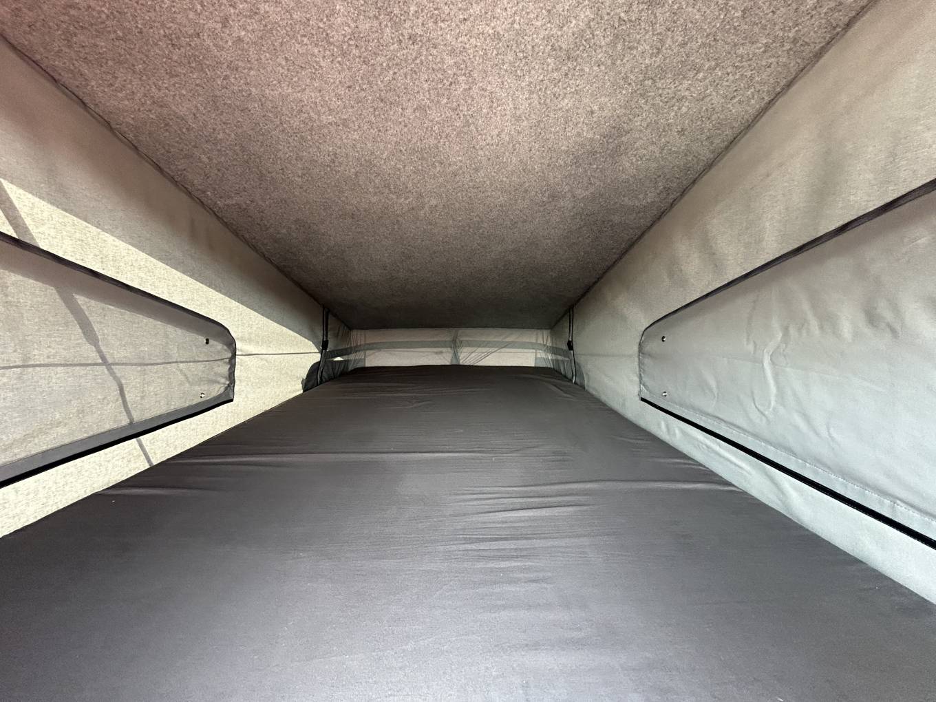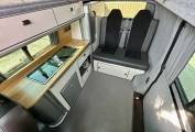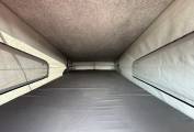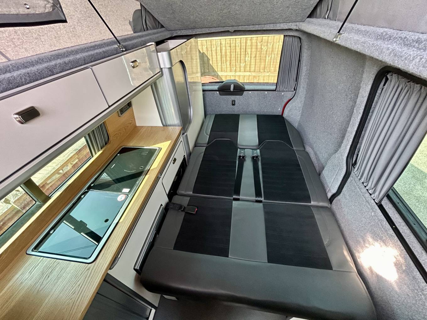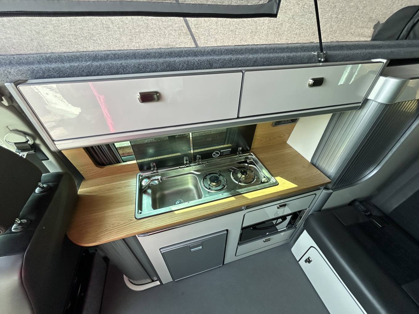 Starting at the front of this campervan you have the two front captain seats which swivel to the rear giving you a great area for relaxing & socialising with space for four around a large central table that is easily removed and stored. The central dinette has a quality kitchen area with sink, 2 gas rings, fridge with icebox & plenty of storage space. As evening nears the rear travelling seats easily convert into a comfortable double rock ānā roll bed with storage underneath. The pop top has a large in-built double bed complete with memory foam mattress. When this is not being used it pushes up to maximise head room, there are also 3 large windows here that let in a large amount of natural light.