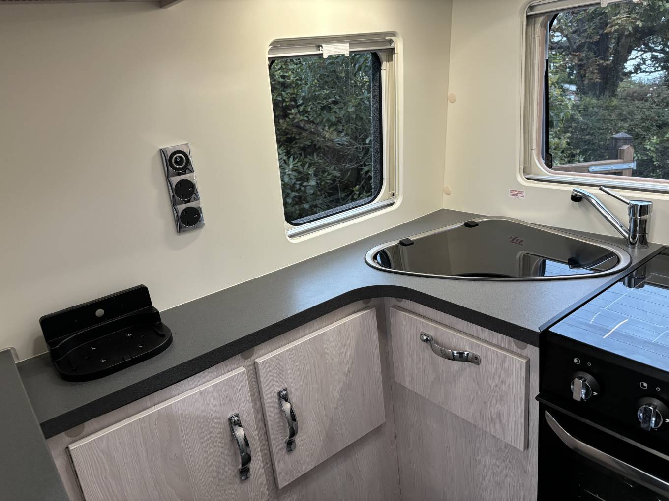 Layout - The campervan has a rear kitchen with gas oven and 3 ring gas hob, a microwave, sink unit, fridge and coffee machine.