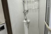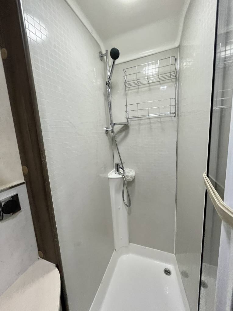The large well equipped washroom / changing room consists of toilet, hanging wardrobe and 3 drawers, wash basin with storage below and a seperate shower room and shower door