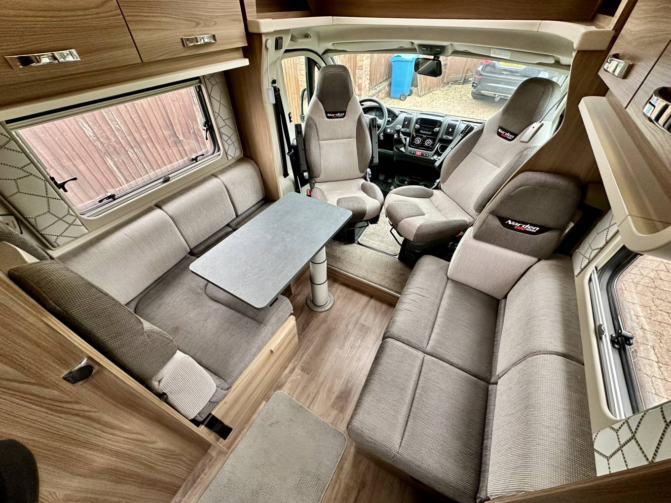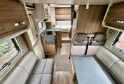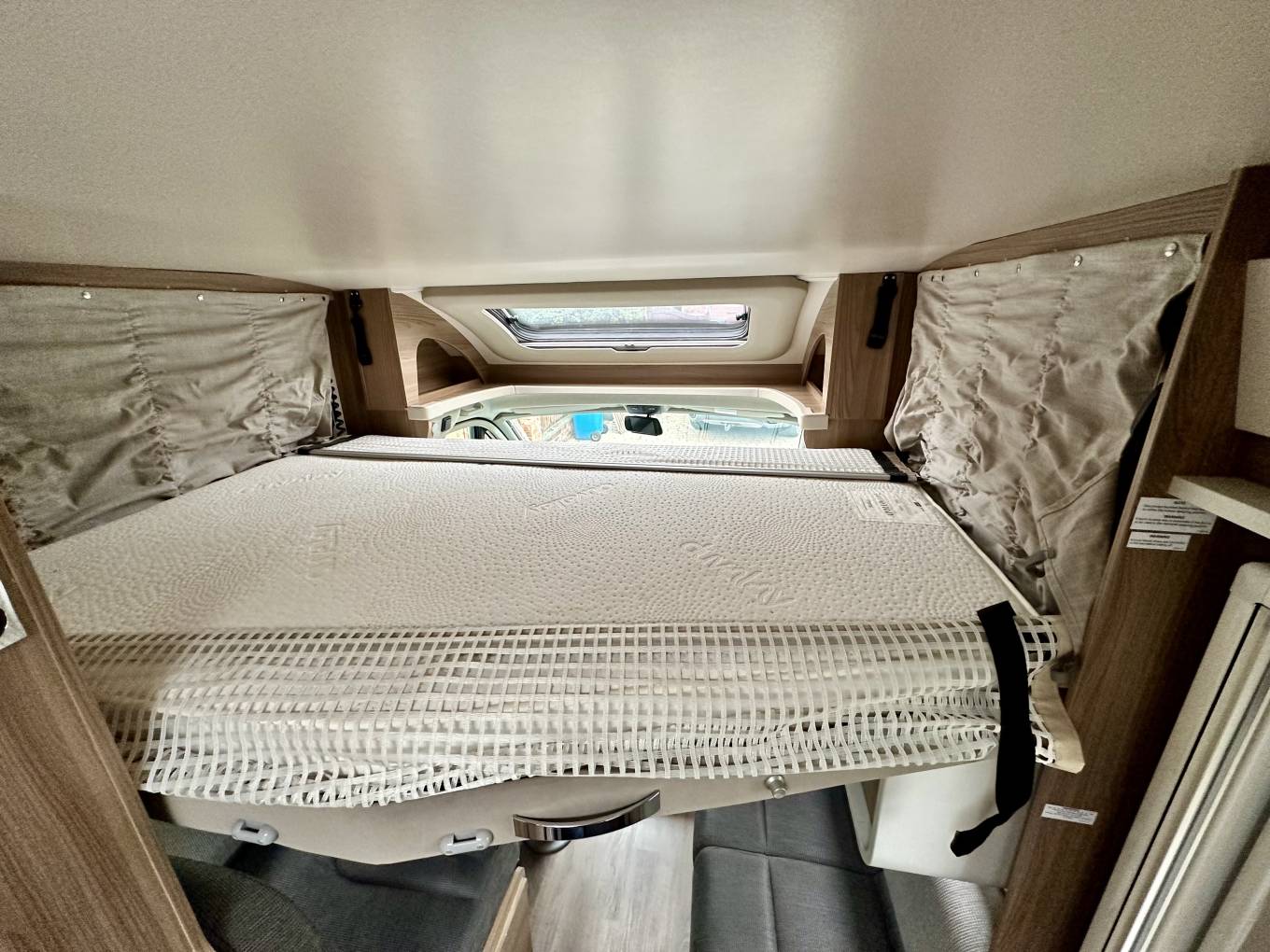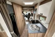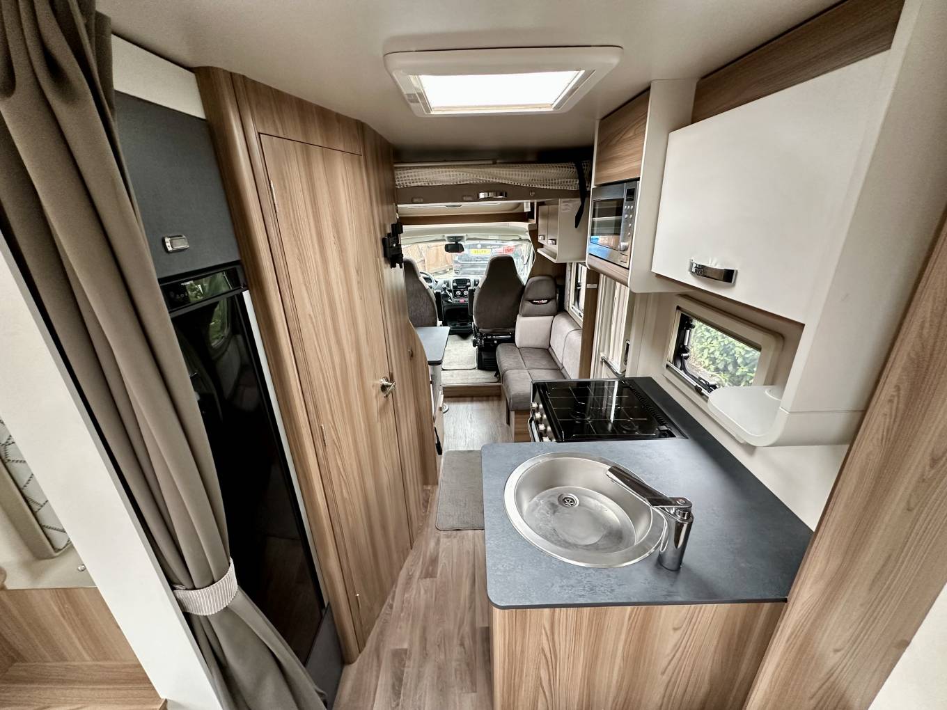 Starting at the rear of the motorhome you will find the popular rear island bed which has 2 positions and still has plenty of space to move all round. Here you will also find plenty of storage and a large vanity mirror. The storage area under the bed can be accessed internally and externally. Moving forward you will find the well equipped kitchen area which includes a cooker, with 3 gas burner hob, plus oven and grill, extractor fan, microwave, sink with mixer tap, extendable worktop, plenty of storage space and a double hinged fridge freezer which can be opened from both sides. Adjacent is the practical washroom which includes a toilet, wash basin with mixer tap, large mirror, storage and a separate shower attachment. In the heart of the motorhome you will find the spacious dinette area which is flooded with natural light thanks to the panoramic windows and large overhead skylight. This area easily seats 6 people utilising the two front captain seats making this perfect for entertaining or relaxing in. As the night draws in, this effortlessly turns in to a double bed. Above this, is the comfortable drop down double bed completing this 6 berth mortorhome.