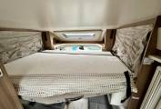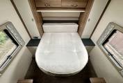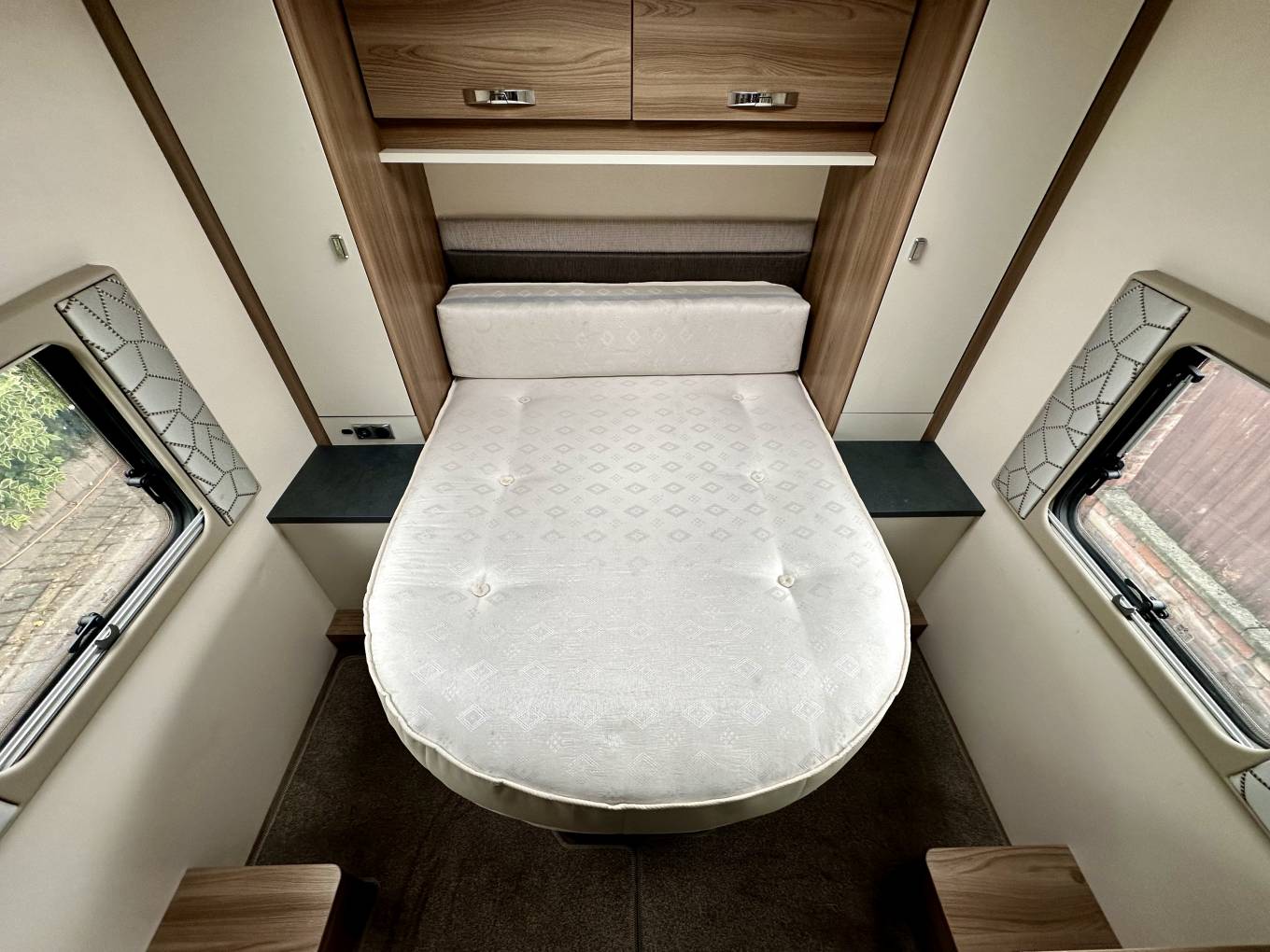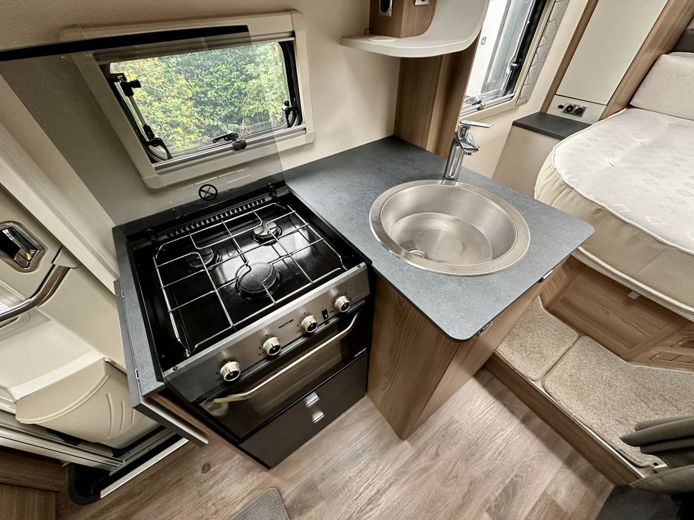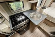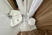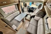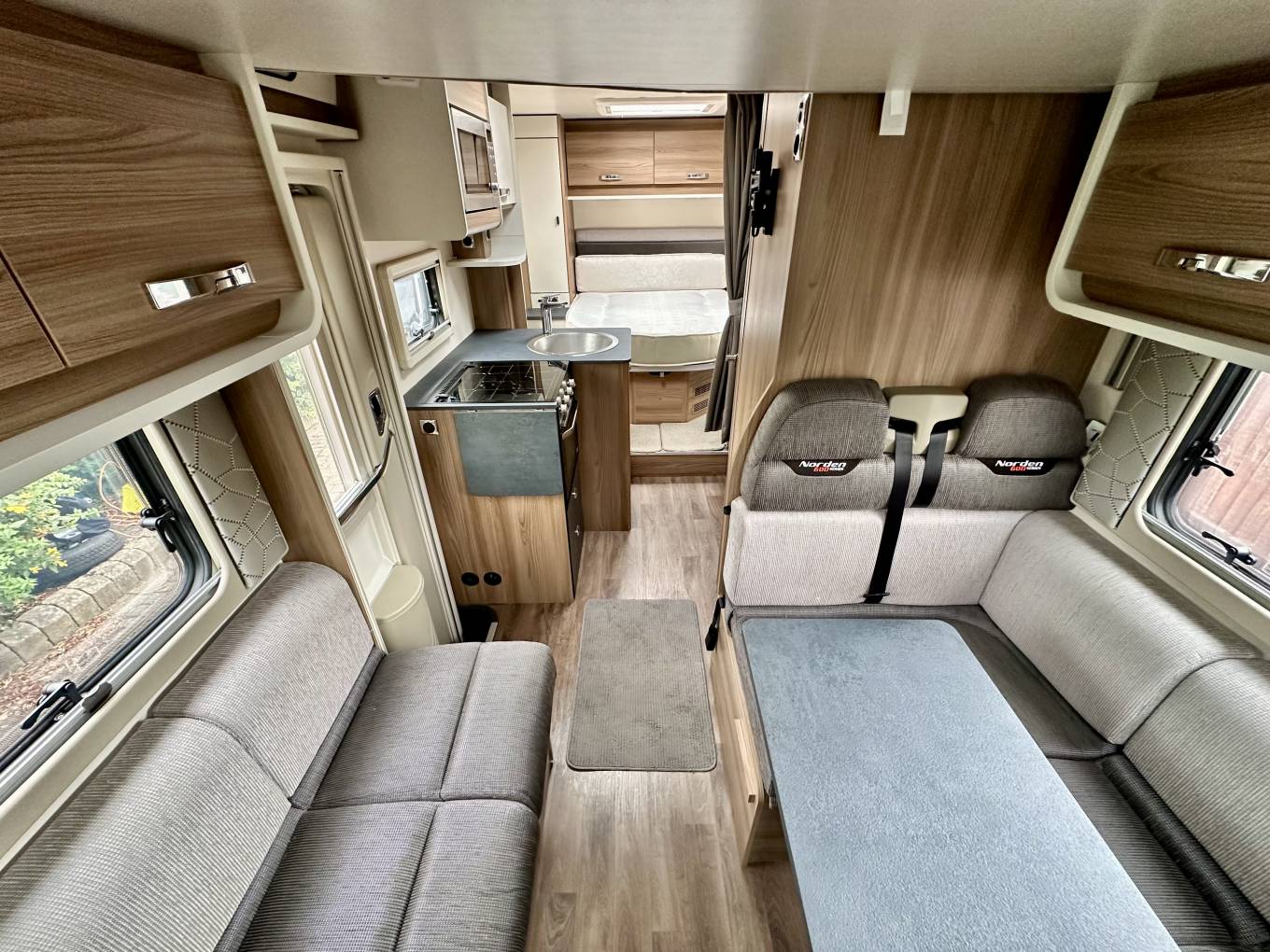 Starting at the rear of the motorhome you will find the popular rear island bed which has 2 positions and still has plenty of space to move all round. Here you will also find plenty of storage and a large vanity mirror. The storage area under the bed can be accessed internally and externally. Moving forward you will find the well equipped kitchen area which includes a cooker, with 3 gas burner hob, plus oven and grill, extractor fan, microwave, sink with mixer tap, extendable worktop, plenty of storage space and a double hinged fridge freezer which can be opened from both sides. Adjacent is the practical washroom which includes a toilet, wash basin with mixer tap, large mirror, storage and a separate shower attachment. In the heart of the motorhome you will find the spacious dinette area which is flooded with natural light thanks to the panoramic windows and large overhead skylight. This area easily seats 6 people utilising the two front captain seats making this perfect for entertaining or relaxing in. As the night draws in, this effortlessly turns in to a double bed. Above this, is the comfortable drop down double bed completing this 6 berth mortorhome.