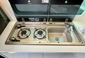 The kitchen comes fully equipped with gas hobs, sink with water pump and tap, Alpicool 50 litre fridge with freezer and plenty of overhead storage throughout. To the side of the kitchen is a large wardrobe section ideal for clothes storage. Both the bench seat and RIB bed also feature storage as well.