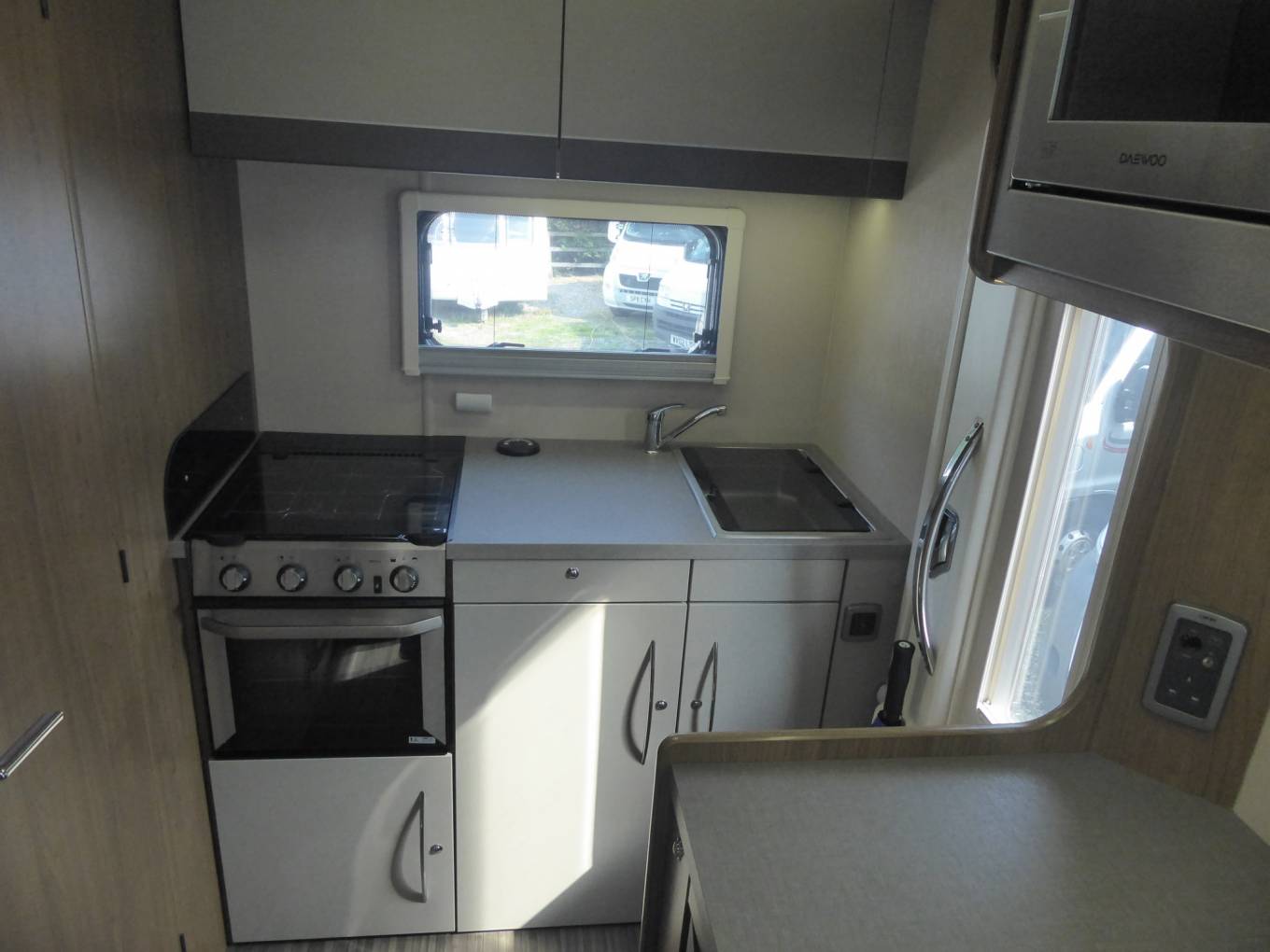 At the nearside rear of the vehicle is the kitchen which has a hob with 3 gas burners, a combination oven/grill, a microwave, a sink, and a fridge with a freezer box.
