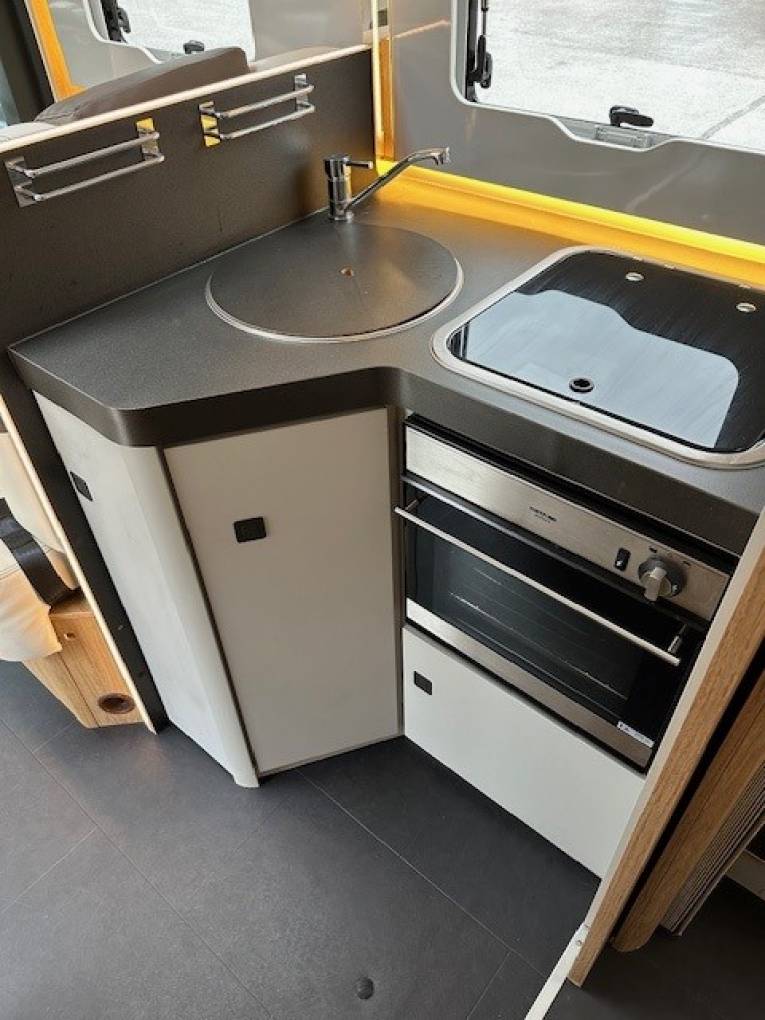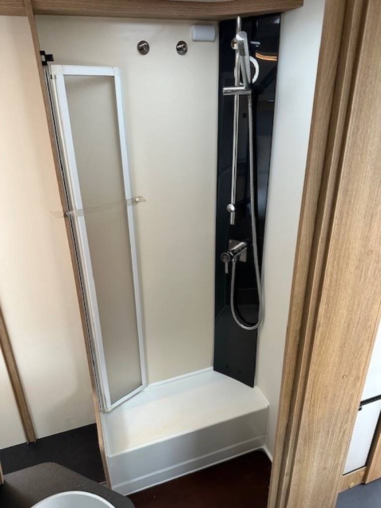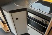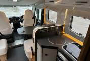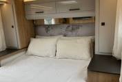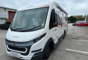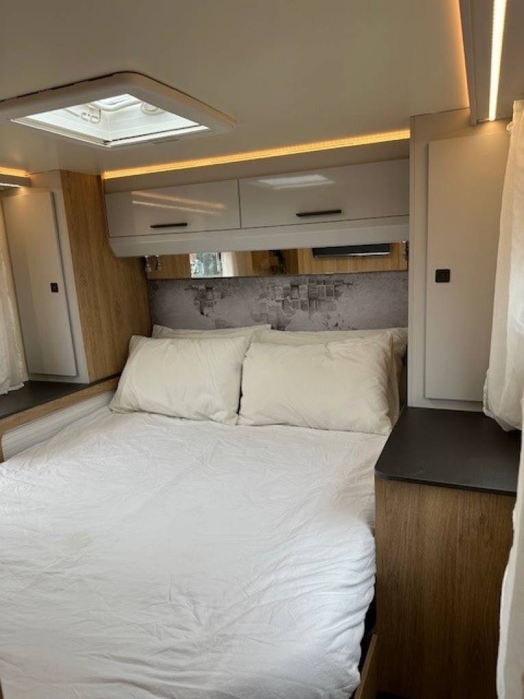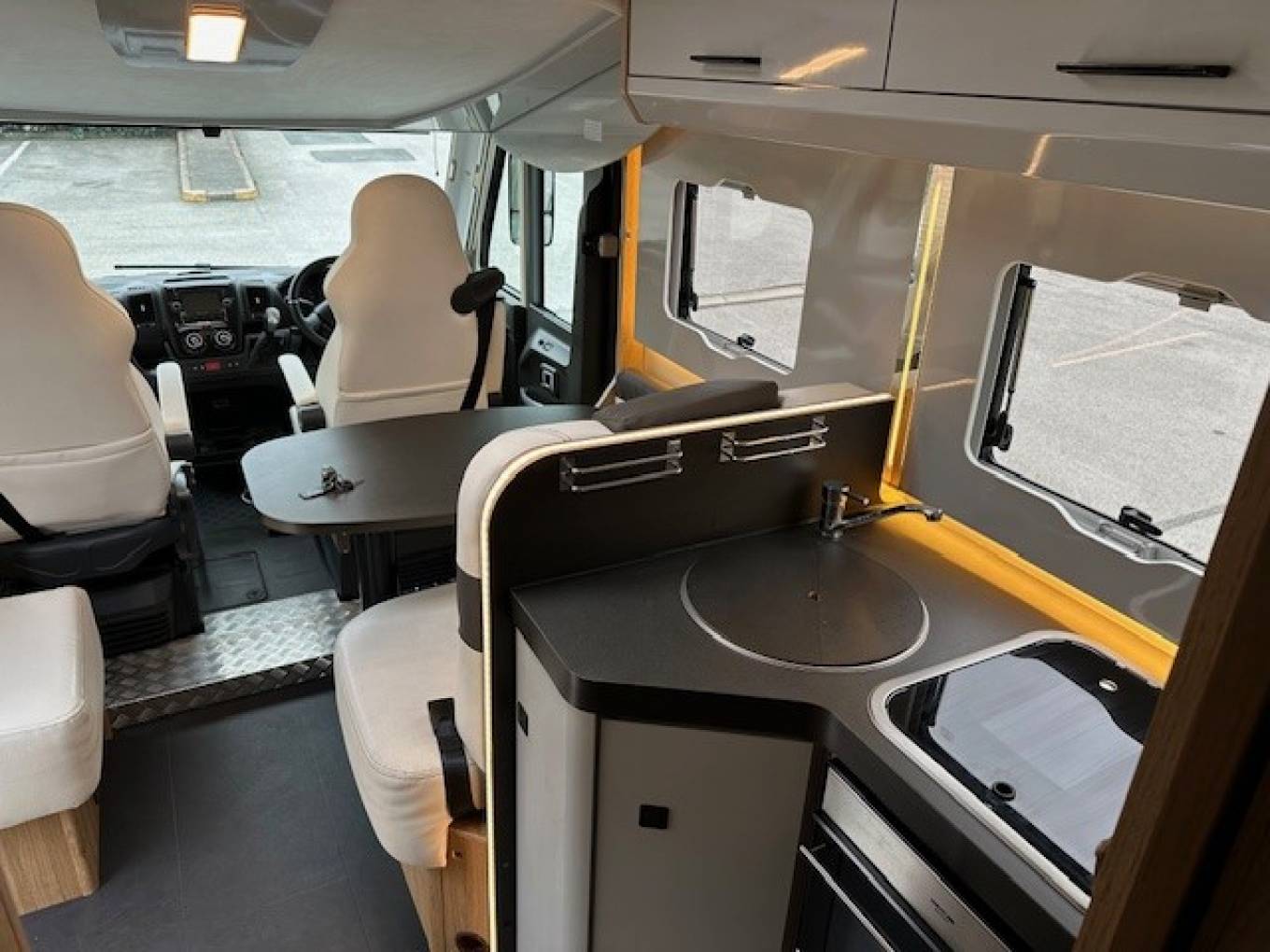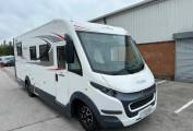 The layout consists of an Island bed, separate shower, toilet/sink, central kitchen, seating in the rear with 2 three point seat belts, swivel captain chairs, drop down double bed. The spec consists of heating, hot water, 3 burner hob, oven/grill, large 3 way fridge, water tanks, blinds and flyscreens, leisure battery, control panel, large garage, adjustable rear bed height, external 240socket, BBQ point, solar panel, TV aerial, Rev camera, alloys, leather interior.