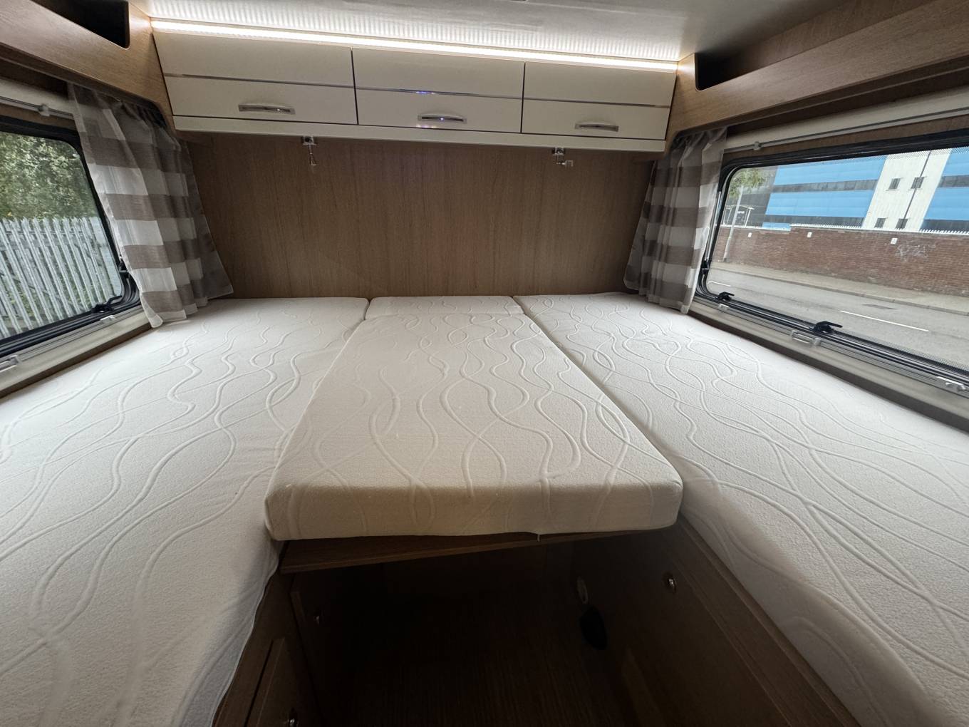 The rear fixed bed above the large garage can be either 2 fixed singles or with the included extra mattress you can make a double