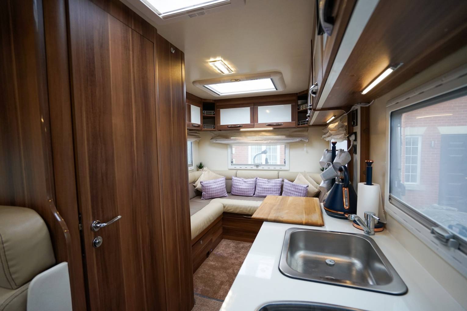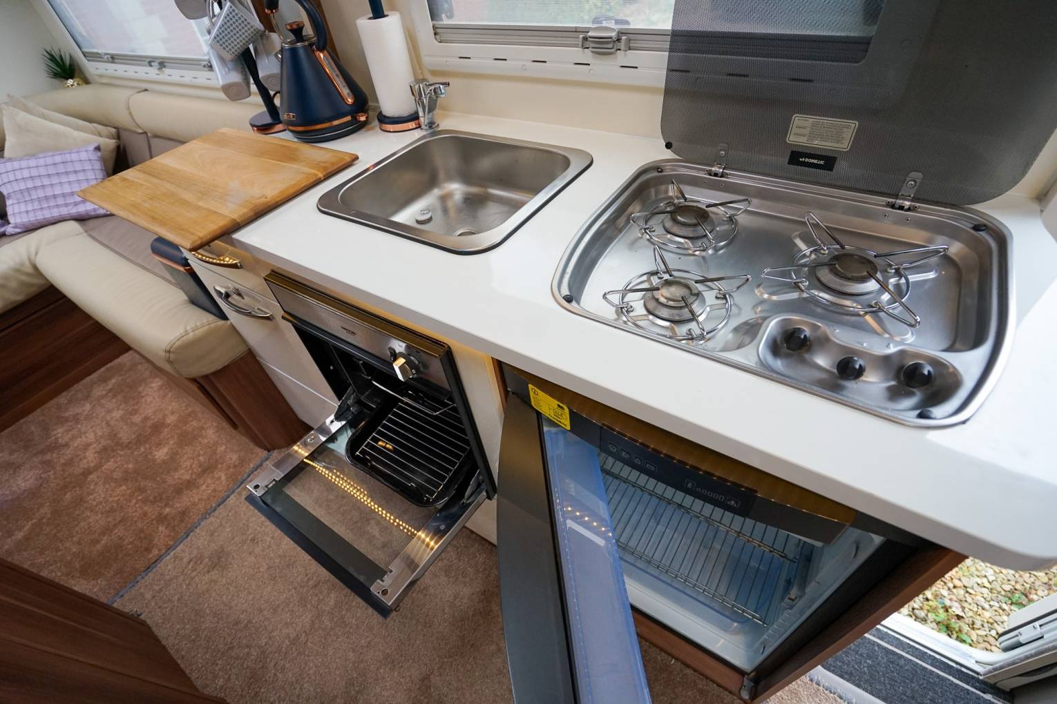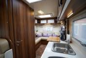 A kitchen sits in the middle, fully equipped with three gas hobs, 3-way fridge with freezer compartment, oven & grill, sink, and a microwave fitted into one of the overhead lockers.