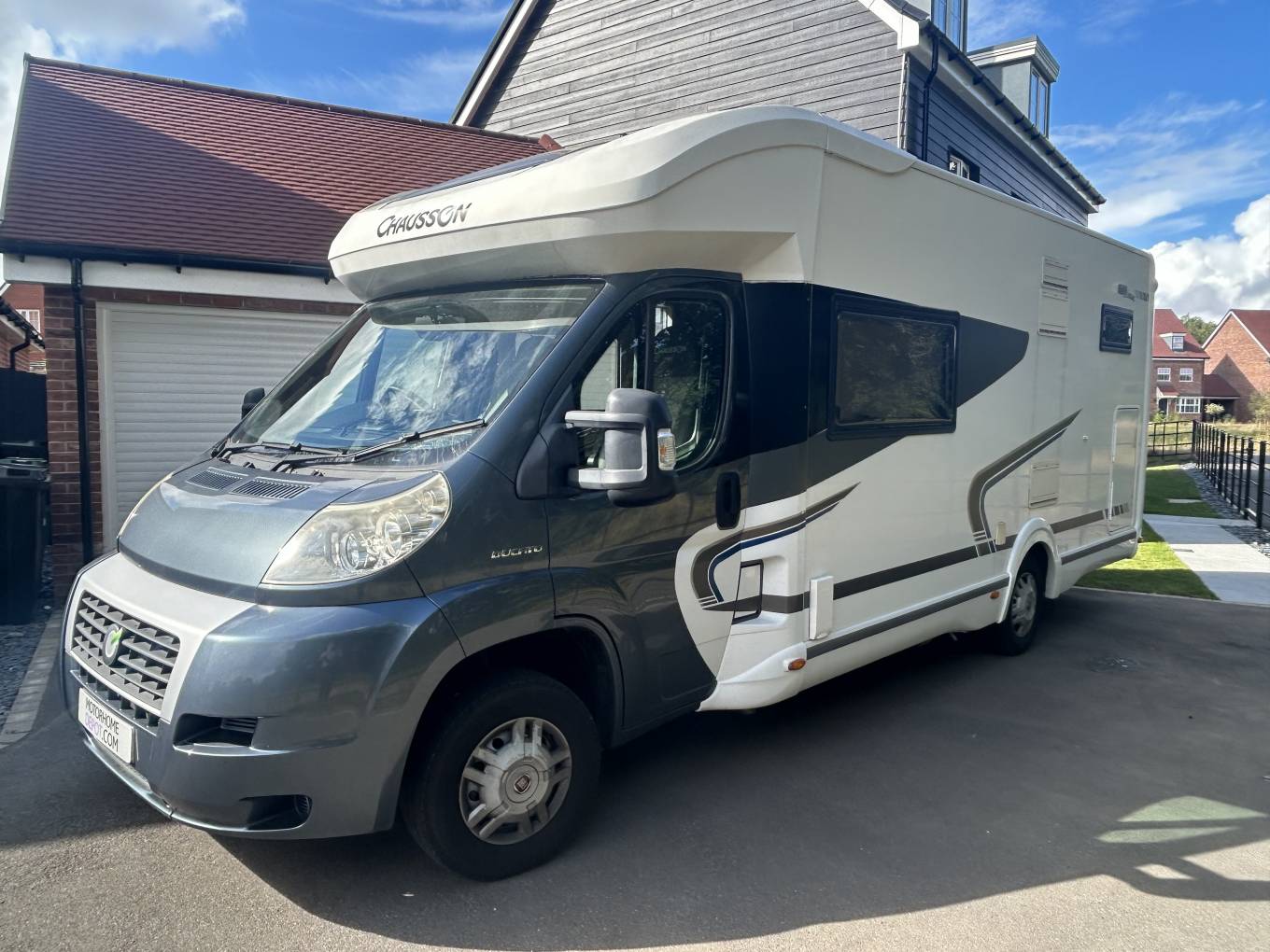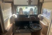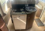 This Chausson is built on the Fiat Ducato chassis and has a powerful 2.3l engine with 150 bhp and a 6 speed manual gearbox. It comes with cab air conditioning, cruise control and a reversing camera. The Suite Garage has a great internal layout - with a spacious lounge at the front that comprises of a forward facing double sofa, two side facing single sofas and the two front Captains chairs. There is a large multi-directional table that is the ideal place for a meal, snack or even browsing a tablet or laptop. The motorhome has a very well equipped central kitchen which has an island style gas hob and sink. It also has a large fridge with separate freezer and an over with grill.