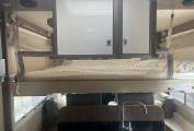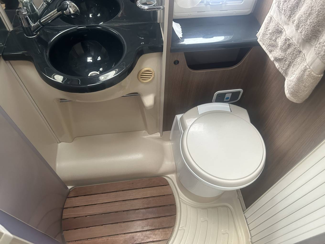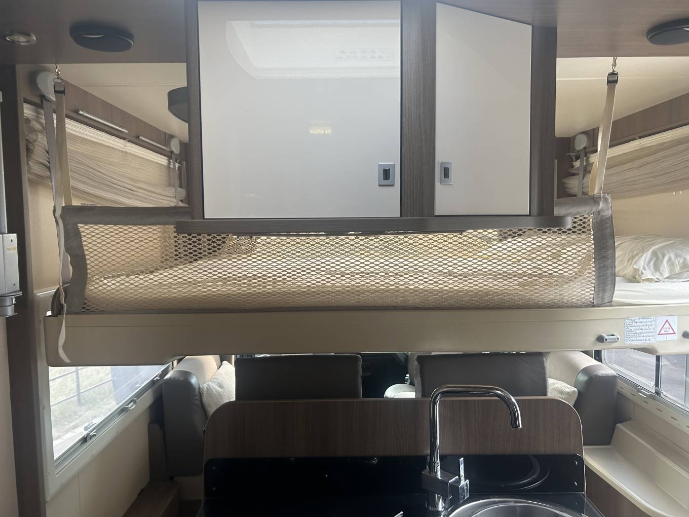 This motorhome is extremely comfortable to sleep in with a large transverse bed at the rear (210cm x 140cm) and an electric drop down double bed above the lounge. A further single can be made up from the sofas and the central table. There is a good sized washroom that features a cassette toilet, sink and shower. It comes with diesel heating and hot water on electric and gas,