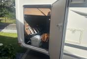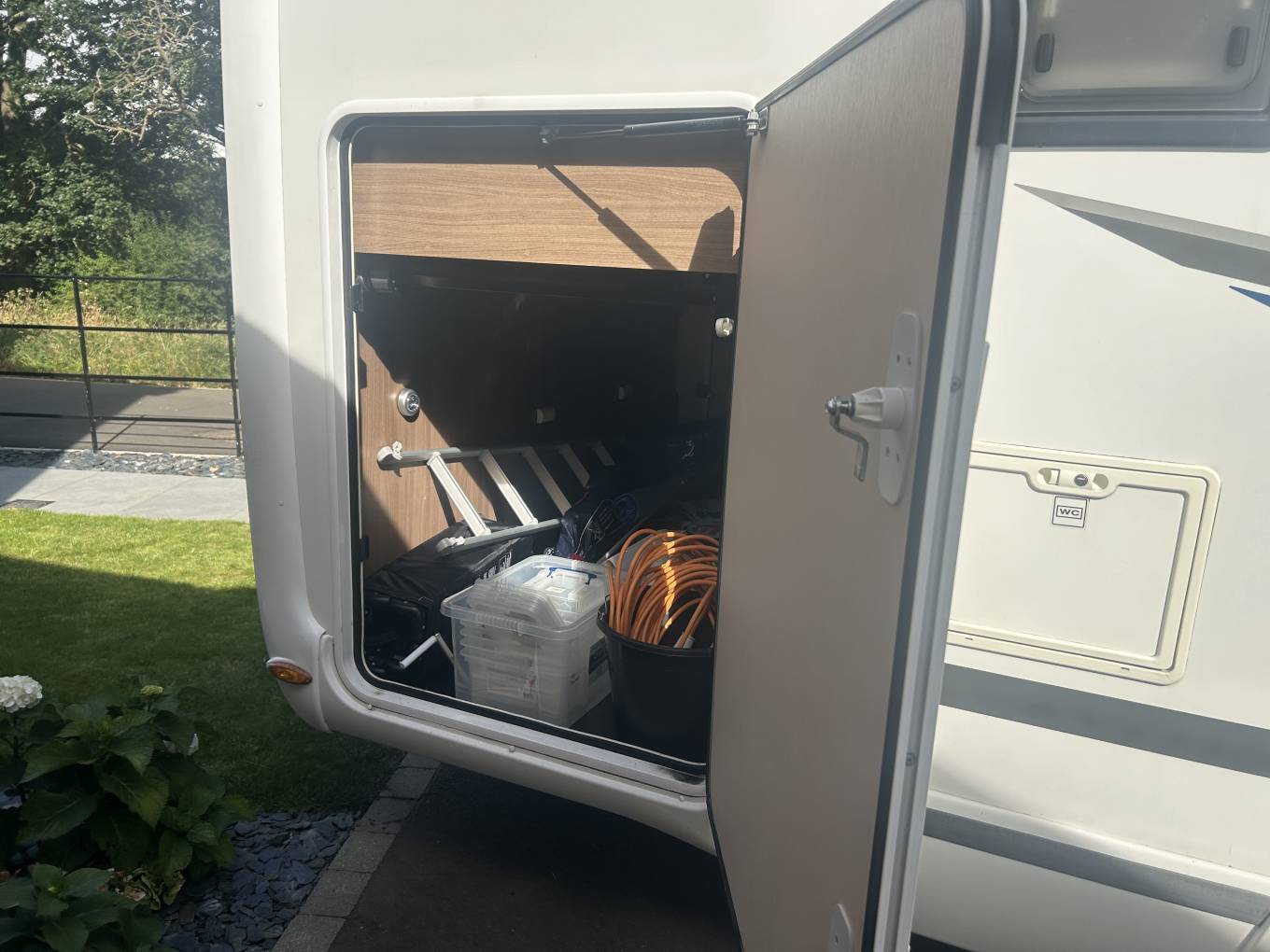 One of the main features of the motorhome is the large garage. The bed can be raised giving you plenty of storage space - the door opening measures 115cm x 85cm wide. It would be ideal for bikes or sports equipment. There is also a large wind-out awning, blanks for a bike rack and comes with its own pull out bbq.