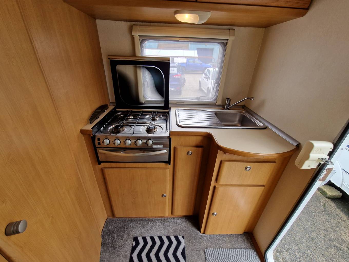 - Enter the van using the double electric step and the kitchen is immediately on your right, with a large steel sink with draining board and chrome mixer tap, a four gas burner hob with glass lid and a grill below. Located in the tall dresser unit behind is the 3-way powered fridge.Upper lockers and lower cabinets provide plenty of storage for all your holiday provisions.