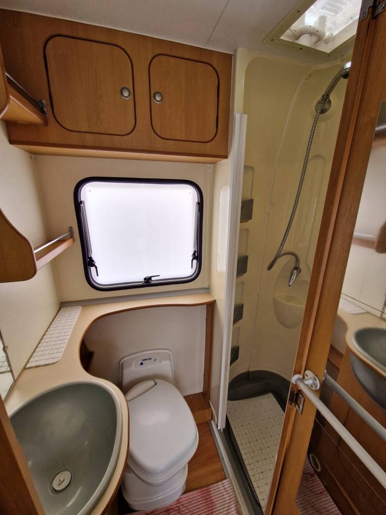 - The washroom benefits from a separate shower cubicle with perspex shower door, a washbasin with mirror above and cupboard below, a Thetford cassette swivelling toilet with electric flush and double cabinet above.