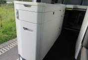 The all-white kitchen unit houses a two-burner hob and sink combination with permanent worktop to either side as well as a slide-out extension on the left. The fridge – a 70-litre compressor model, with freezer compartment – is at the end of the unit and also has a slide-out action, meaning you can easily access it from inside the vehicle or out. Storage comprises four soft-close drawers of varying sizes (there’s also a flap hiding two gas isolator valves), as well as a small but useful fold-up ledge for use when the sliding door is open. Plus, there’s a double high-level locker.