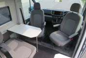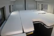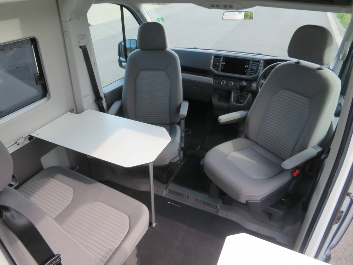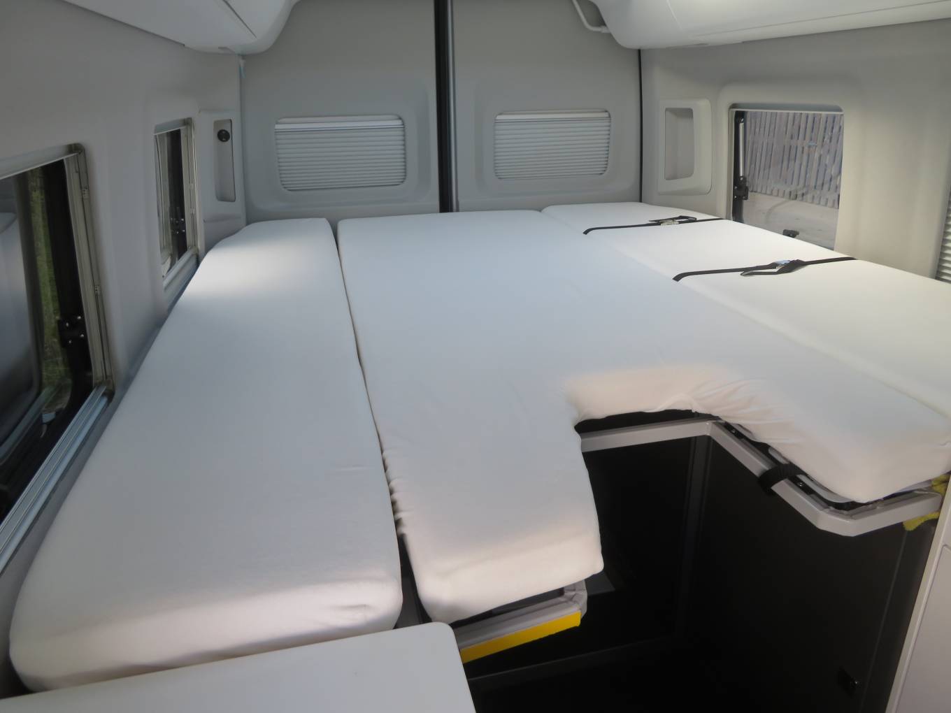 The Grand California is large enough to support the kind of floorplan you’re more likely to find in a coachbuilt motorhome. There’s a forward lounge – comprising both cab seats swivelled and the double rear travel seat – as well as a central kitchen and washroom, and rear ‘permanent’ double bed. The lounge itself is compact but effective with its shaped, detachable table. Top-hinged side windows provide the views out and ventilation, aided by a wind-up sunroof.It a Comfy two berth with in a high degree of comfort. There are three mattress sections in the rear of the motorhome, each of which sits on a plastic support system, providing superb support as well as ventilation. Maximum double-bed dimensions are 6ft 6in x 5ft 6in, and there is a cut-out in the central section to make it easier for you to get in and out of bed. That centre base can also be hinged upright to provide space for transporting larger items.