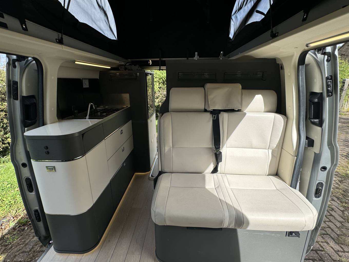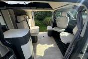 The lounge area offers versatile seating with two forward-facing seats equipped with 3-point seat belts, an adjustable table, and swivel seats for the driver and passenger. This area can easily convert into a double bed, providing the fourth berth in the camper.