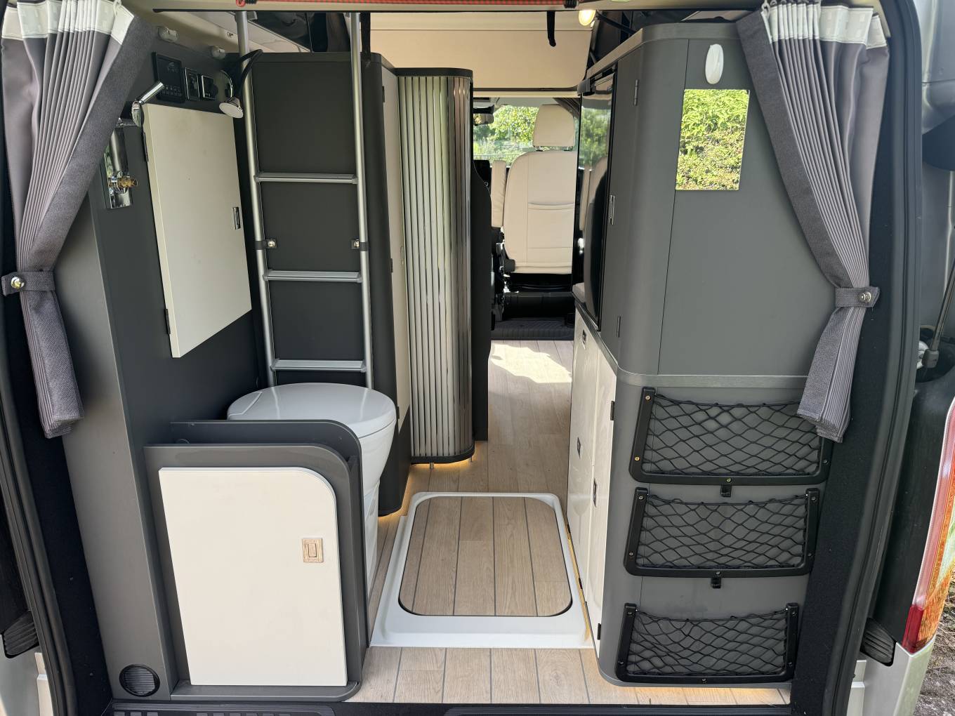 At the rear, you’ll find a well-appointed toilet area with a Thetford swivel toilet, shower controls, and generous storage, along with a ladder leading to a spacious and comfortable overhead bed. The kitchen is both practical and stylish, featuring a handwash basin, a 2-burner gas hob, and a 12V fridge. The wardrobe is surprisingly roomy and includes the battery isolator and boiler drain-down point.