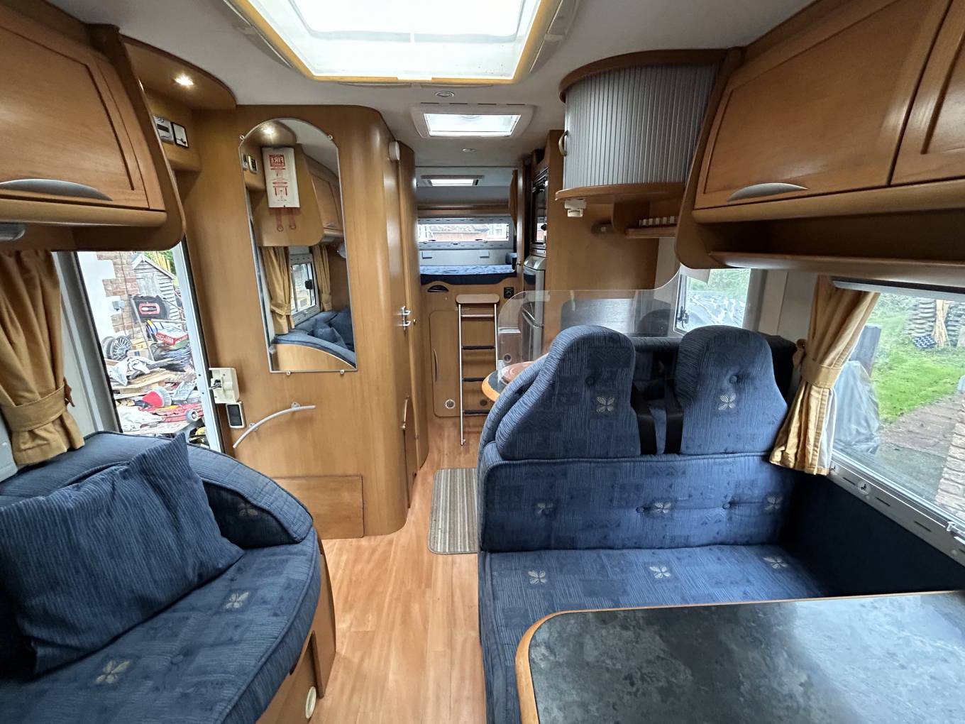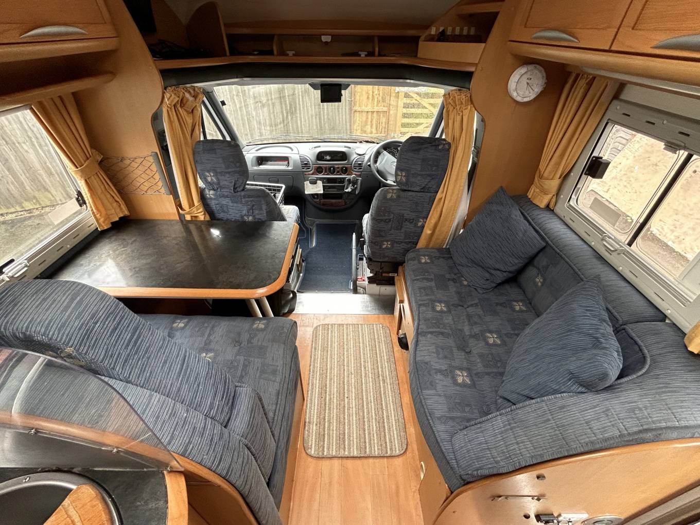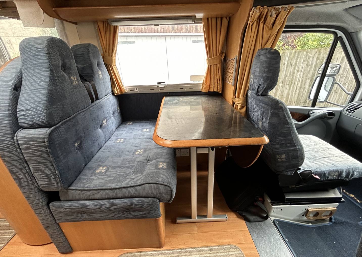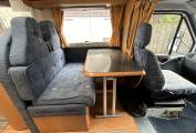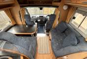 Behind the cab is the spacious lounge dinette featuring a forward facing 2 seater sofa with 2 seat belts, a side facing sofa and a very solid dining table. These all combine to convert into a double bed. The dining table can be removed if you want more space.