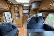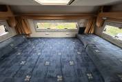 The sleeping arrangements consist of a fixed rear transverse double bed which has a small pull out ladder which hides away under the bed when not in use. The other 2 sleeping berths are made up by converting the lounge dinette into another double.