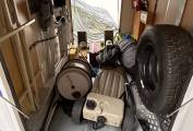 The washroom has a shower, a Thetford cassette toilet, a wash basin and tap and a storage cupboard for your toiletries.