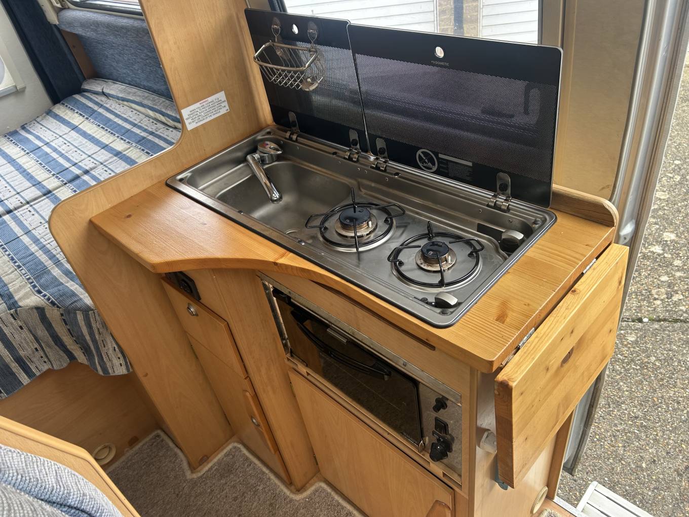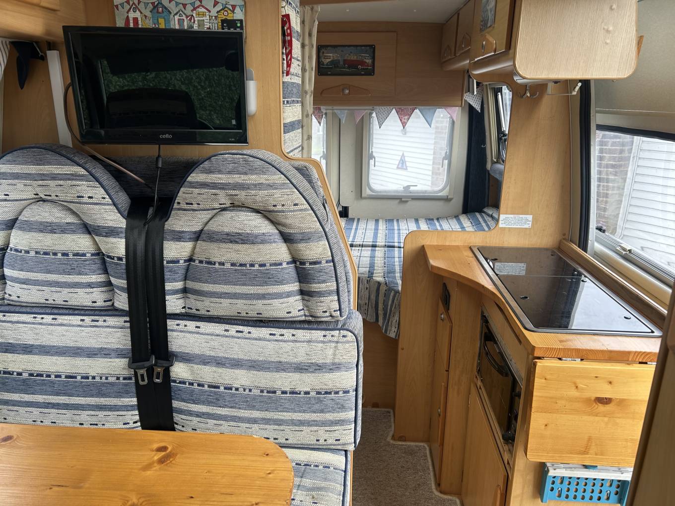 Externally this camper has lots of extras including a wind-out awning, tow bar, 1 gas bottle with newly fitted quick change, solar panel and two leisure batteries making it perfect for off-grid use.