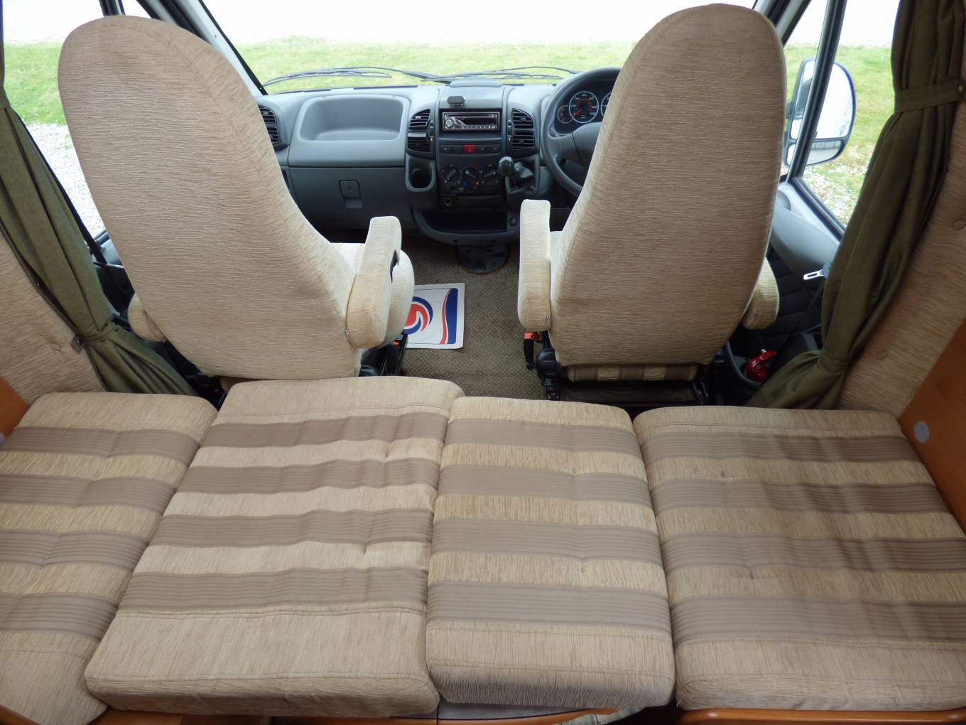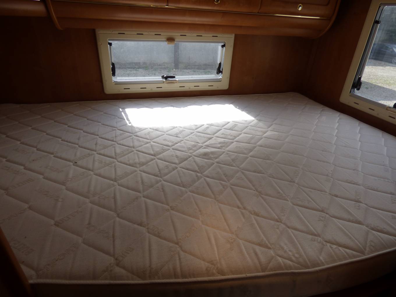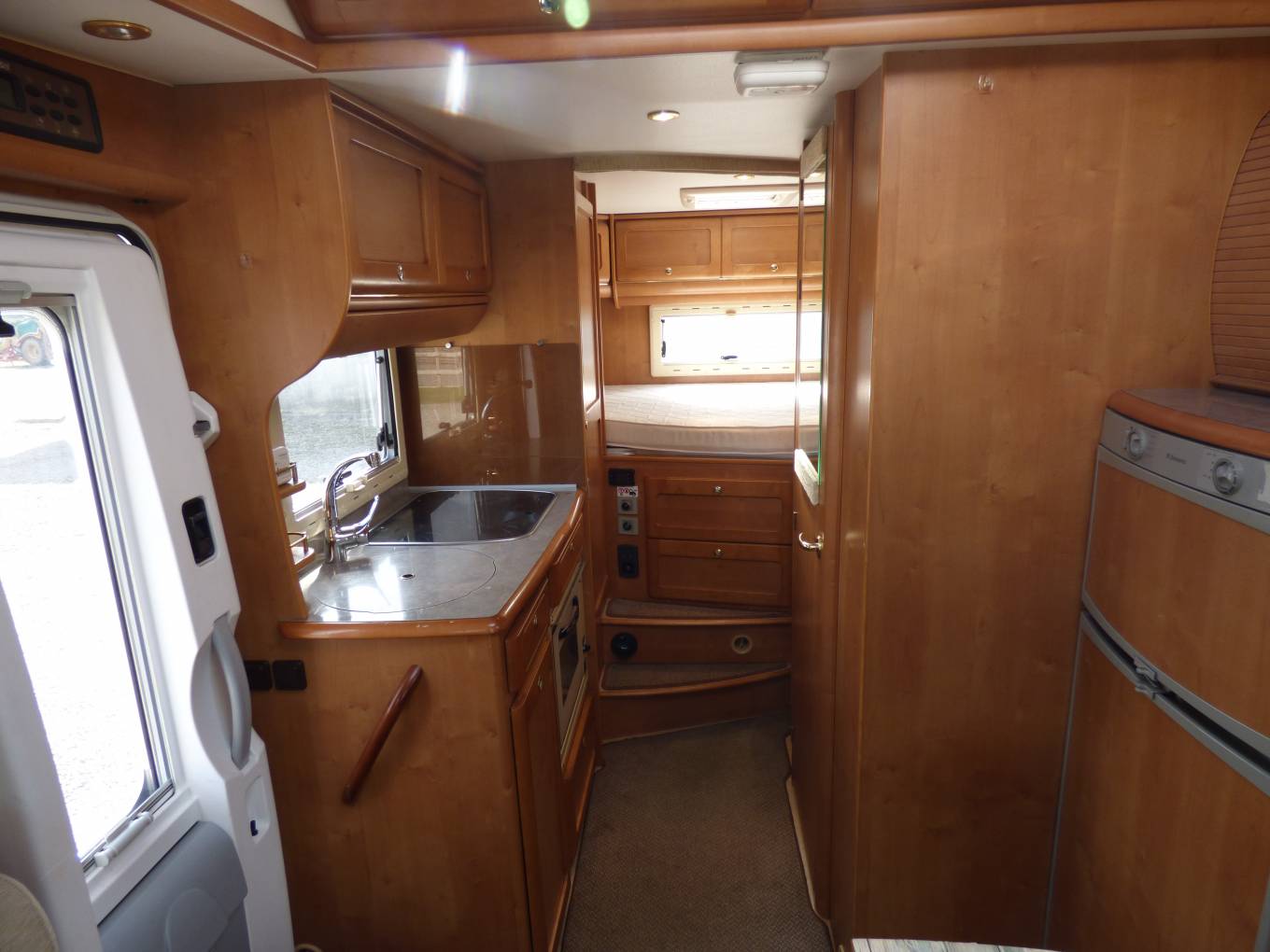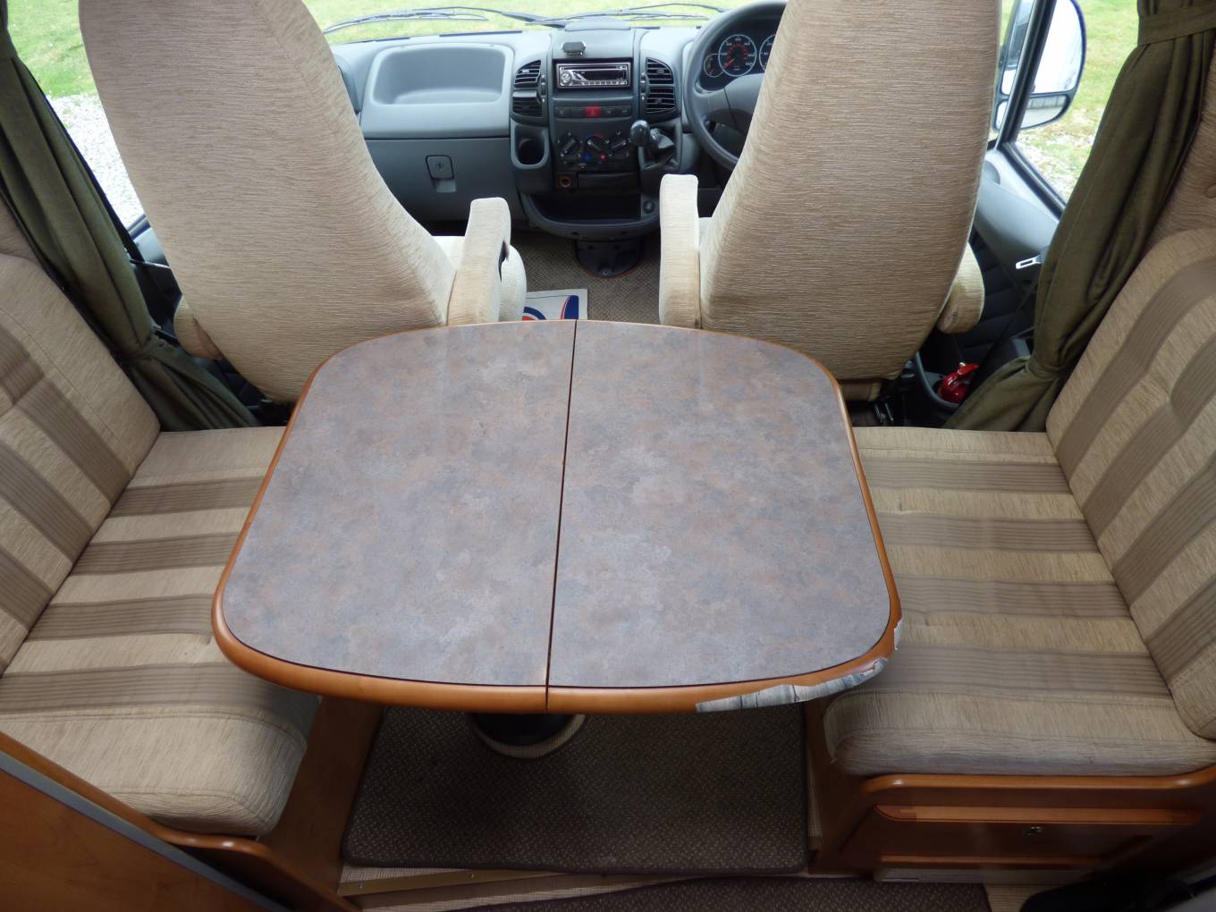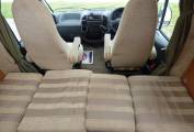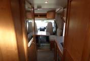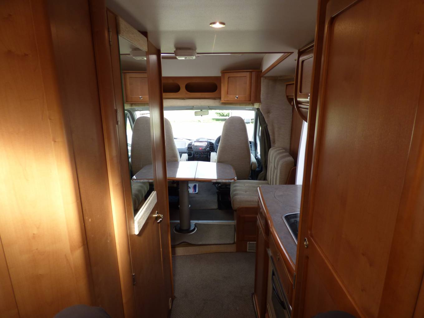 The dinette area has a large folding table, two side bench seats facing each other and the passenger and drive seats both swivel to form seating for at least 4 adults around the table. All cushions are very smart in a light and modern beige colour which contrast nicely with the rosewood effect lockers and doors. All windows and skylights have both fly screens and nightshades. The rear bedroom area can be separated from the rest of the motorhome with a screen which pulls across.