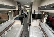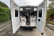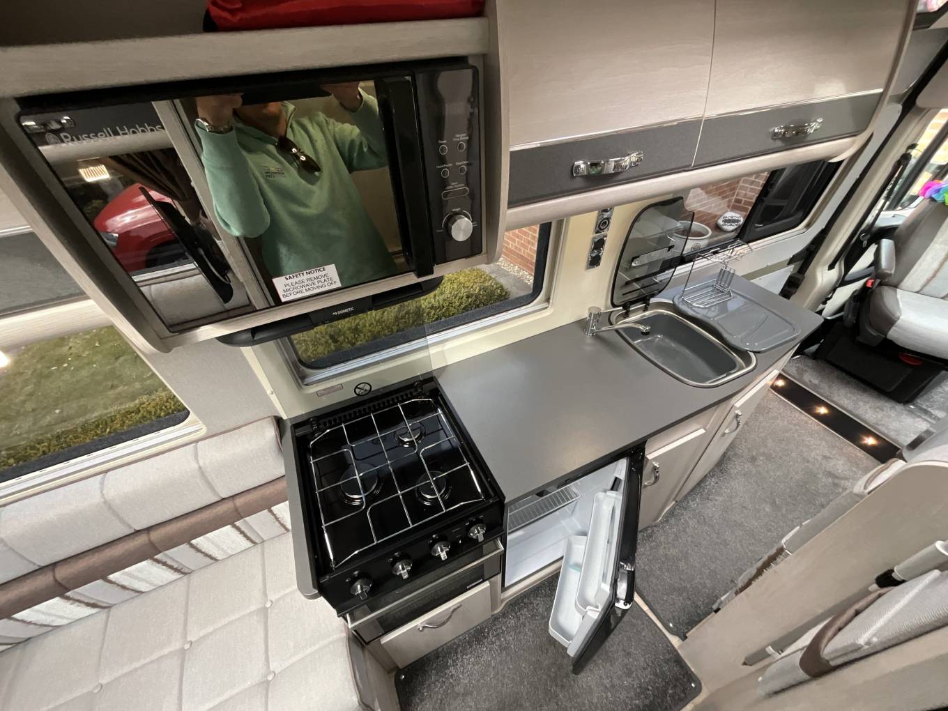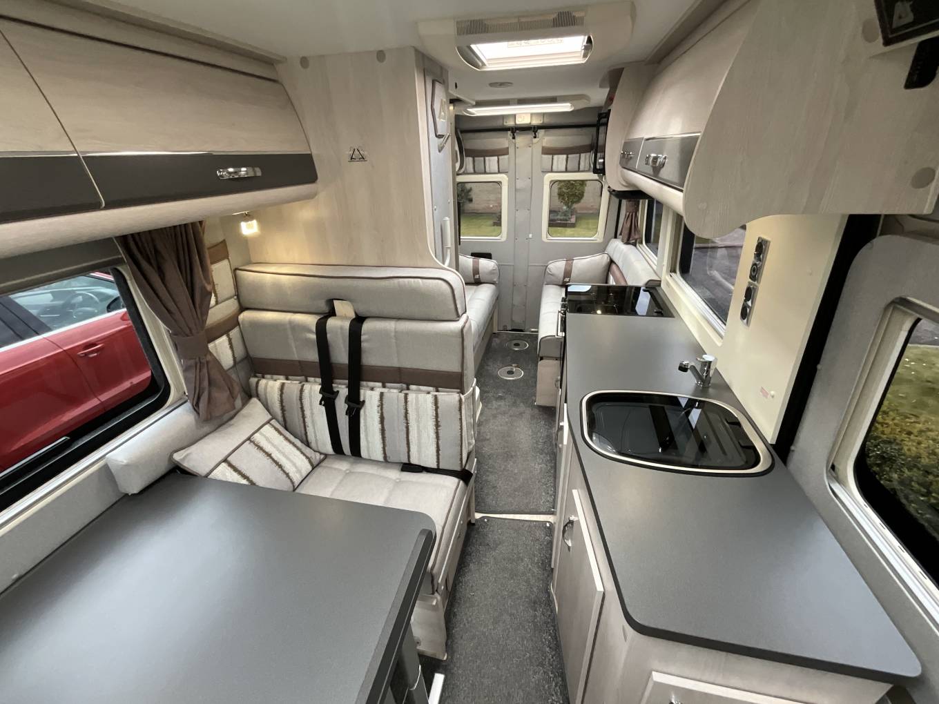 Starting at the rear of the motorhome is the lounge area which is flooded with natural light and is the perfect place to relax and snuggle up to watch TV. This area also dines 4 guests with ease, utilising the removable table and makes a great place to enjoy the summer evenings with the twin rear opening doors, allowing for plenty of fresh air and maximum view. As the night draws in this area also makes up a good sized, double transverse bed. Moving forward there is a central washroom with a Thetford flush cassette toilet, sliding wash basin and shower. Heating and hot water are all provided via the simple to operate Whale heating system. Adjacent to this is the well equipped kitchen which includes combination oven/grill, hob with 3 gas burners, microwave oven, fridge with freezer compartment, sink with mixer tap, plenty of worktop space and ample storage. To the front of the motorhome is the dinette area featuring 2 three point seatbelts which means 4 people can travel safely. This comfortably seats 4 by utilising the front passenger swivel seat and removable table. This area can also be easily converted to a practical double bed completing this 4 berth motorhome. Throughout this motorhome there is an abundance of storage and led lighting.