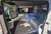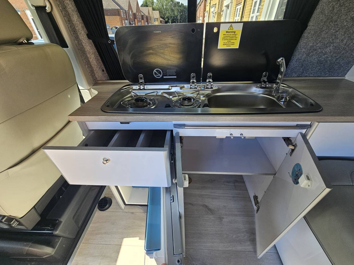 Inside, you’ll find a rock and roll bed with options to elevate each end to relax and watch the stars or surrounding scenery. It comes with a versatile seating area with a centre dinette, and a fully equipped cabin with features such as cab air conditioning, heated seats, and a swivel passenger seat and captain seat to create a flexible lounge or dining space. The high-end finish includes soft-closing cabinet doors, and a fridge freezer is installed to keep food and drinks fresh throughout your travels. A gas bottle is also included, ready for any cooking needs on the road with the 2 ring gas burner.
