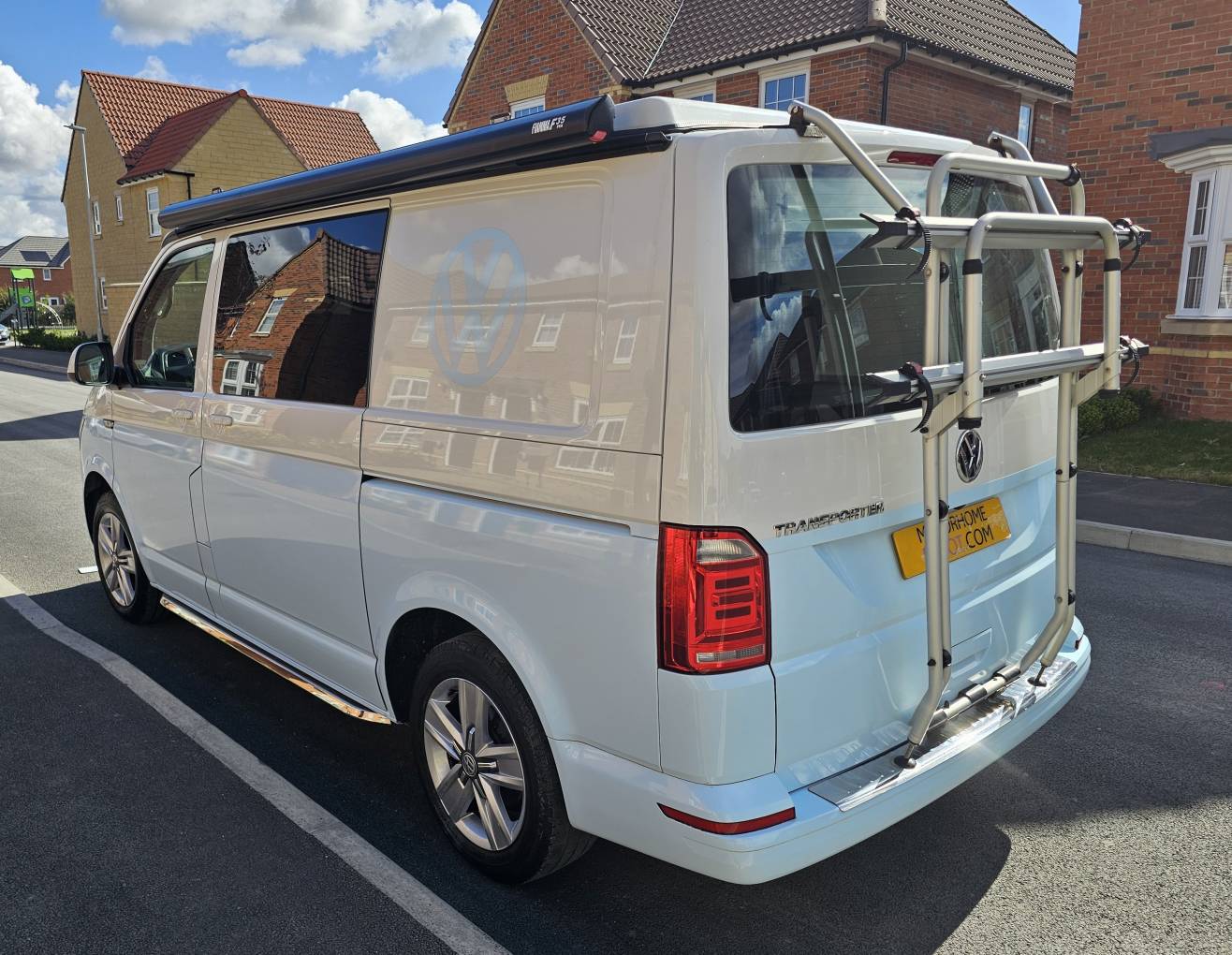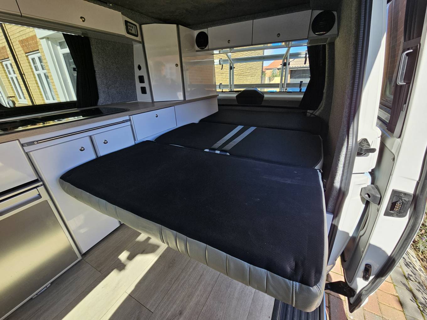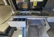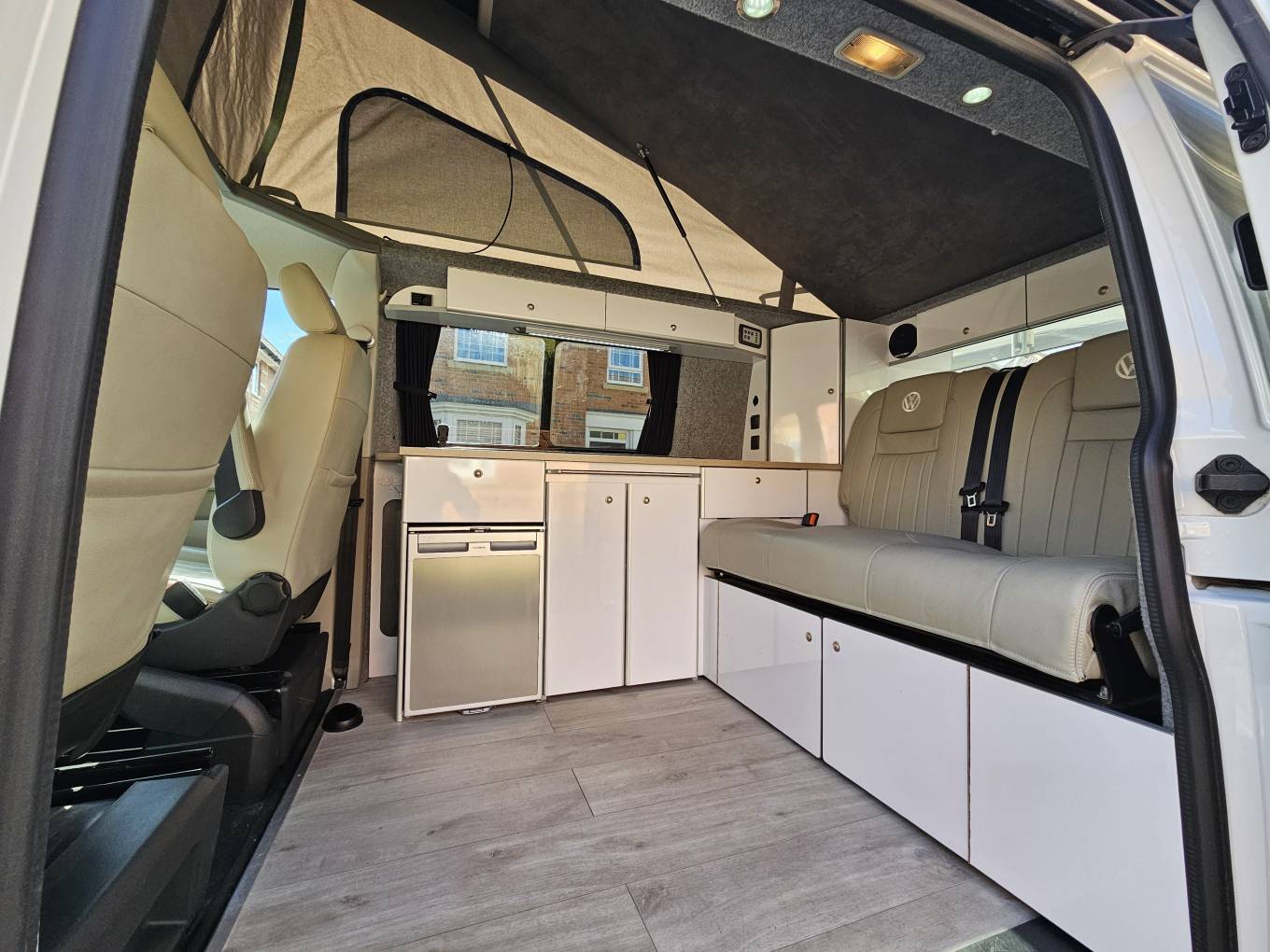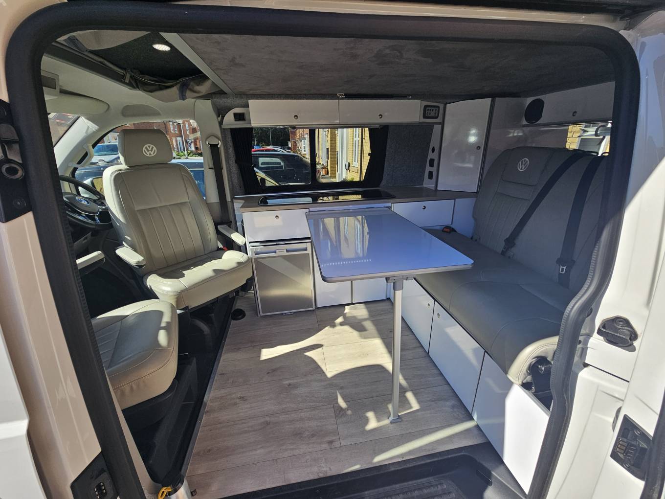 On the exterior, the T6 is equipped with a 2 tone finish of classic white and stunning Atlantic blue, a Fiamma bike rack and back box, reinforced rear struts for extra stability when carrying heavy loads. A Fiamma pull out awning is installed, providing a shaded outdoor area where you can relax or dine, with a table that can be used both inside and outside the van. The pop-up roof enhances the living space and creates a cosy sleeping area for two, while the rock and roll bed can sleep another two comfortably underneath.