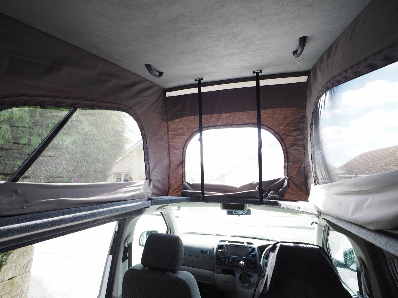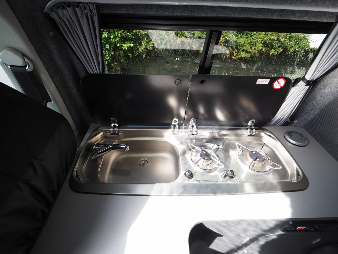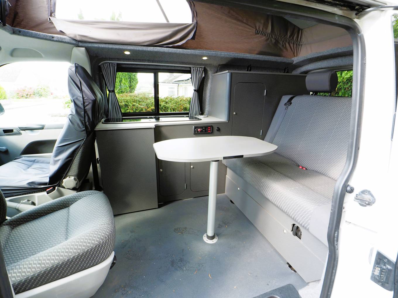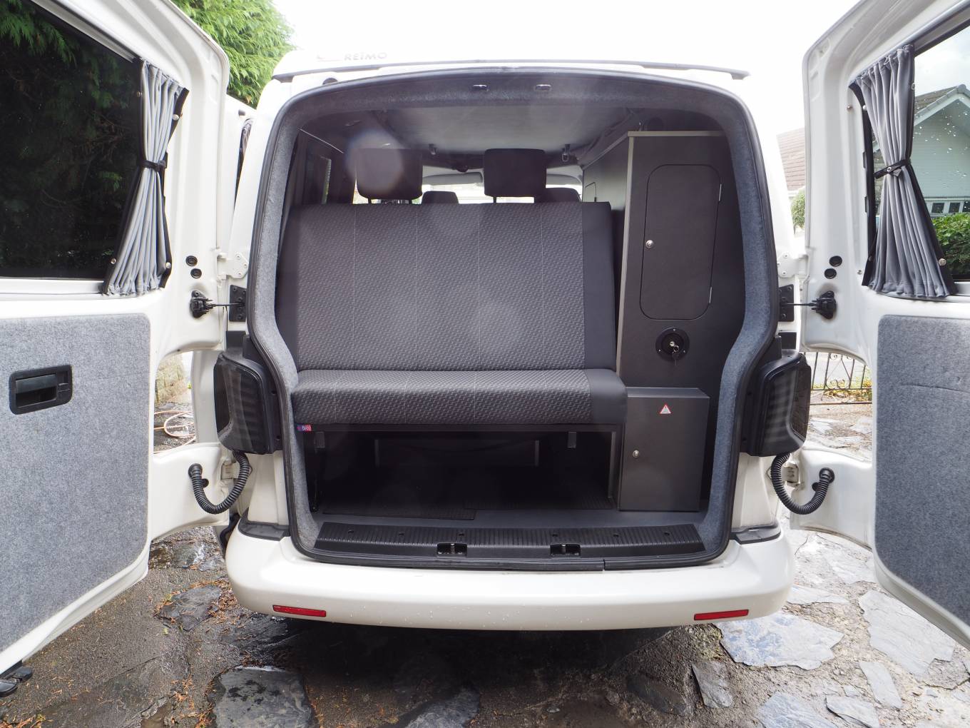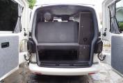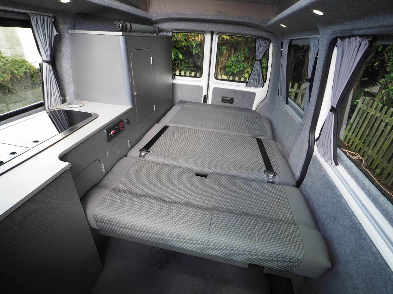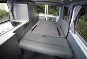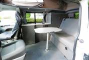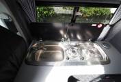 Front passenger seat is on a swivel base and there is an occassional table that makes for a great place to dine, entertain or even to use the van as a mobile office. The Rock and Roll rear bed provides comfortable 2 berth sleeping accomodation and is fitted with two travel belts to accomodate 4 travelling. Two burner gas hob, sink with tap and a 12v Fridge with freezer box provides ample kitchen facilities. Plenty of storage with the built in cupboards and under seat drawer. There is a safe box fitted under the front passenger seat. There is 230v and 12v electrics and a calor gas bottle in a vented cupboard accessed from the rear doors.
