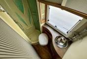 The rear washroom is spacious and comes equipped with a Thetford toilet, shower, washbasin with vanity unit and plenty of storage.