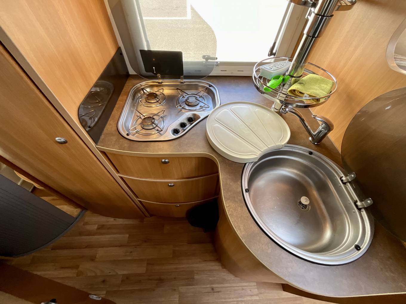 The kitchen is fully equipped with everything the travelling chef needs, including gas hobs, sink with tap, Thetford three way fridge and oven/grill. There is plenty of storage for cutlery, condiments and crockery.