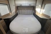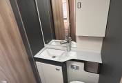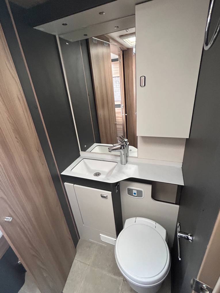 The washroom offers a touch of class, featuring a cassette toilet, a vanity unit with a large mirror, and a separate shower cubicle. Conveniently, you can section off the washroom from both the kitchen and bedroom. The luxurious bedroom includes a height-adjustable island bed with two wardrobes and more mood lighting, providing a peaceful retreat after a day of exploration.