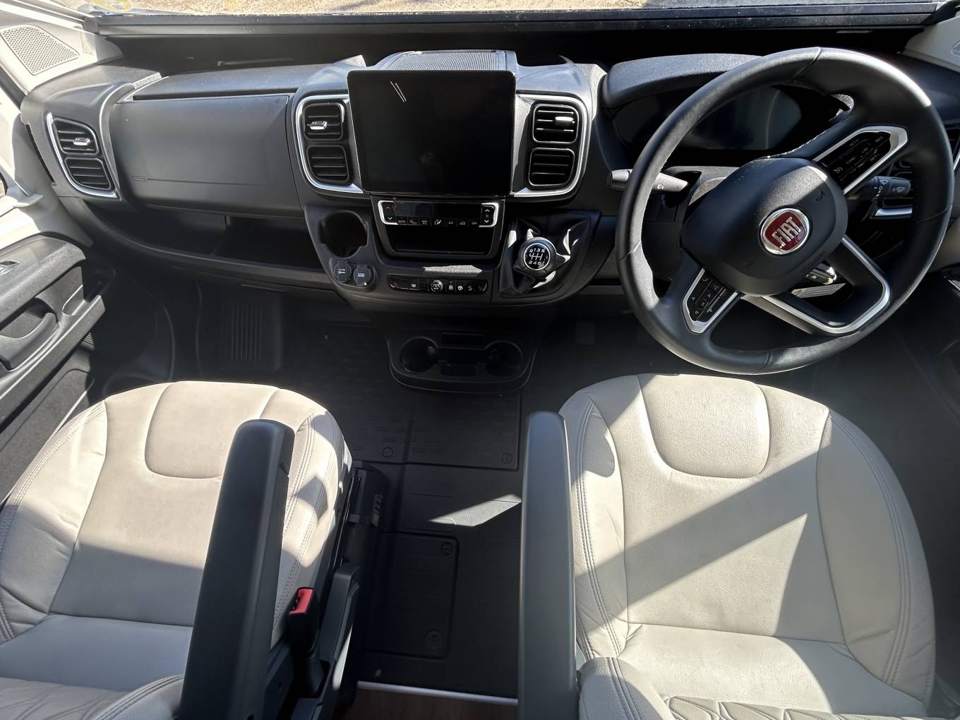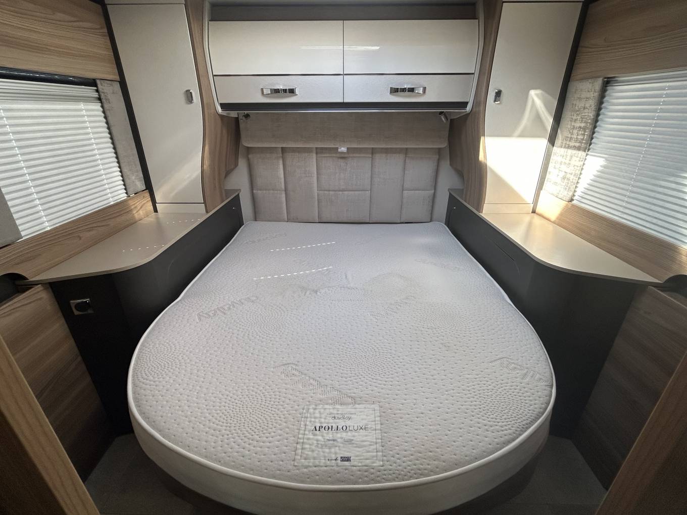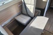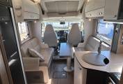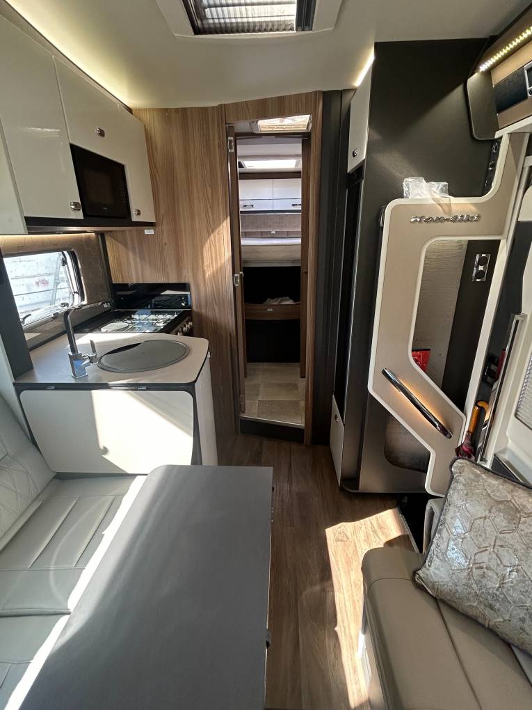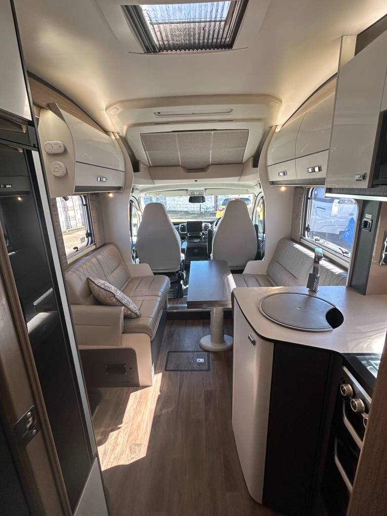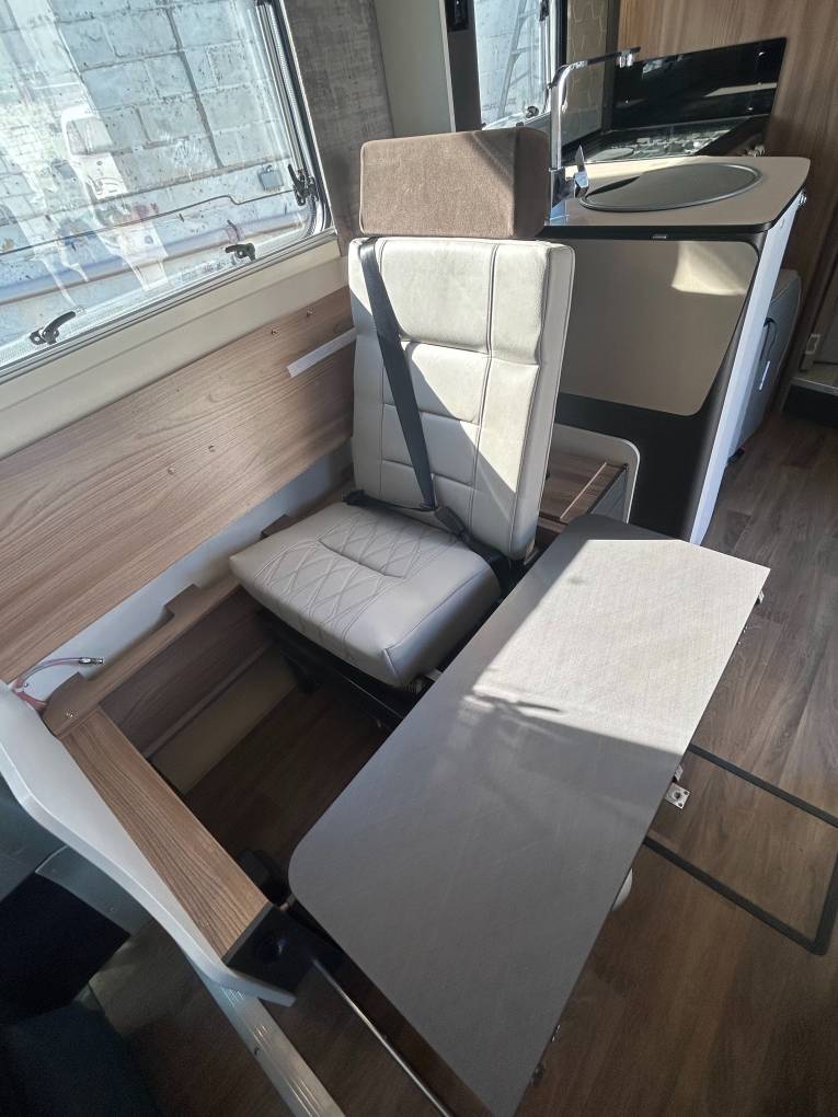Step inside to discover a beautifully designed interior. Two captain seats, along with a spacious seating area featuring two bench seats and two collapsible singles with seat belts,, ensure comfort and safety for everyone. A large electric adjustable table is perfect for dining or relaxing, all set within an atmosphere enhanced by stylish wall storage units and elegant mood lighting throughout.