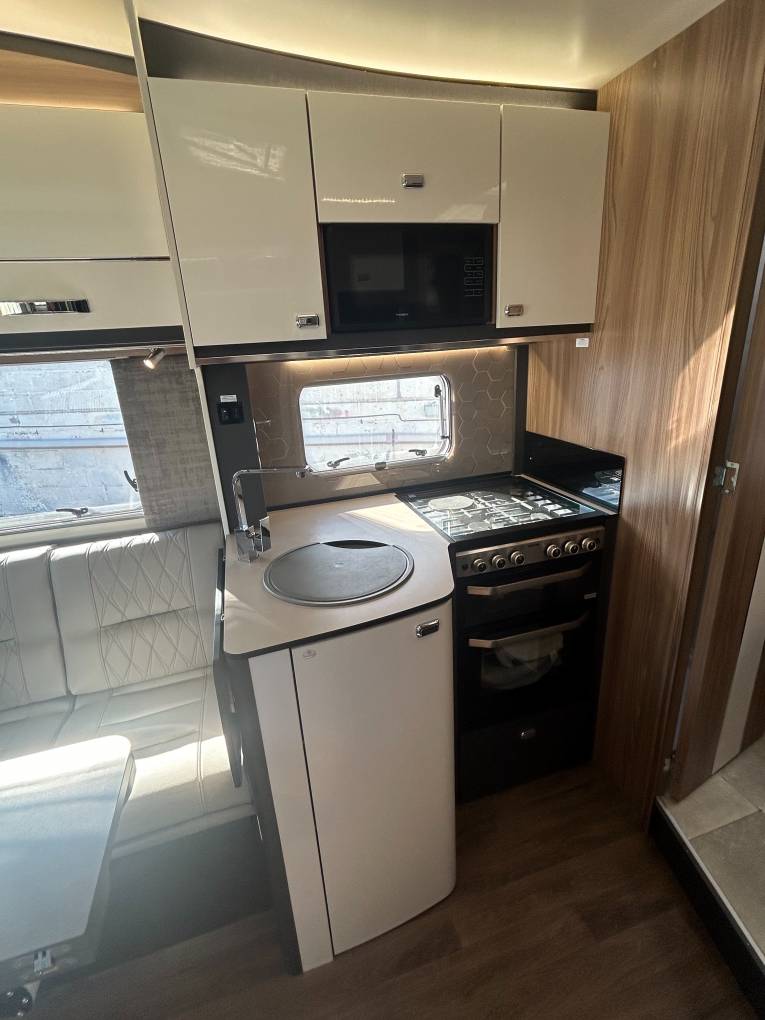 Externally, you’ll love the wind-out canopy for outdoor relaxation, a BBQ point for al fresco dining, and a 240v power point. Storage is never an issue with access to a large garage, and the sleek alloy wheels complete the look of this top-tier motorhome.