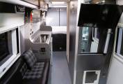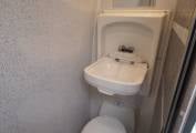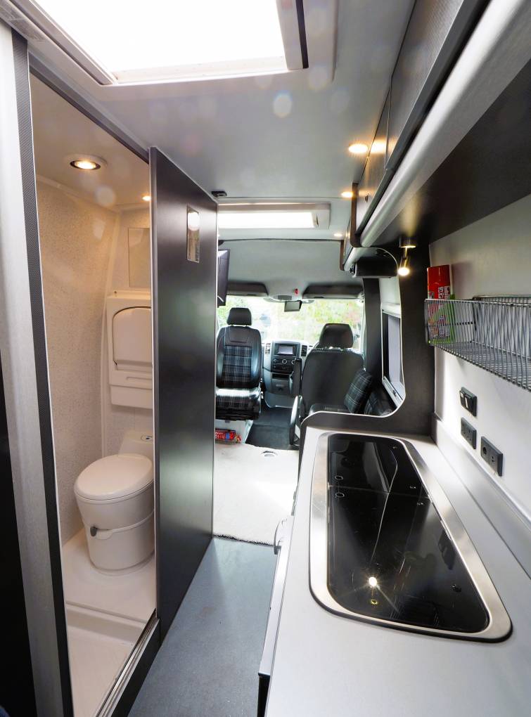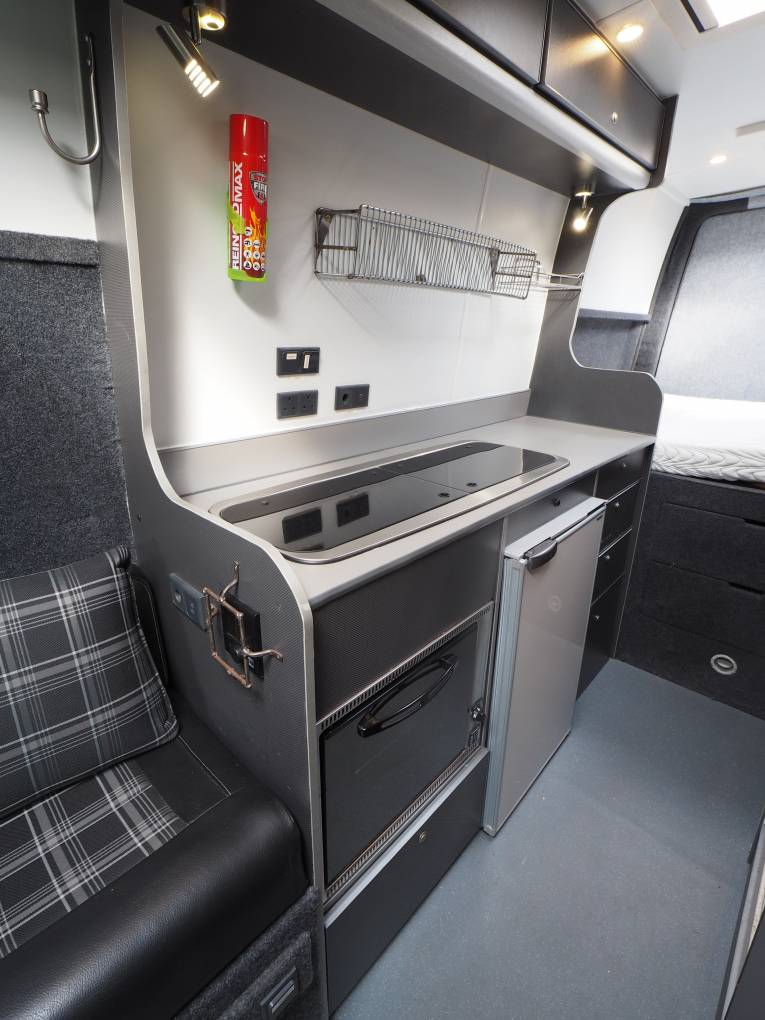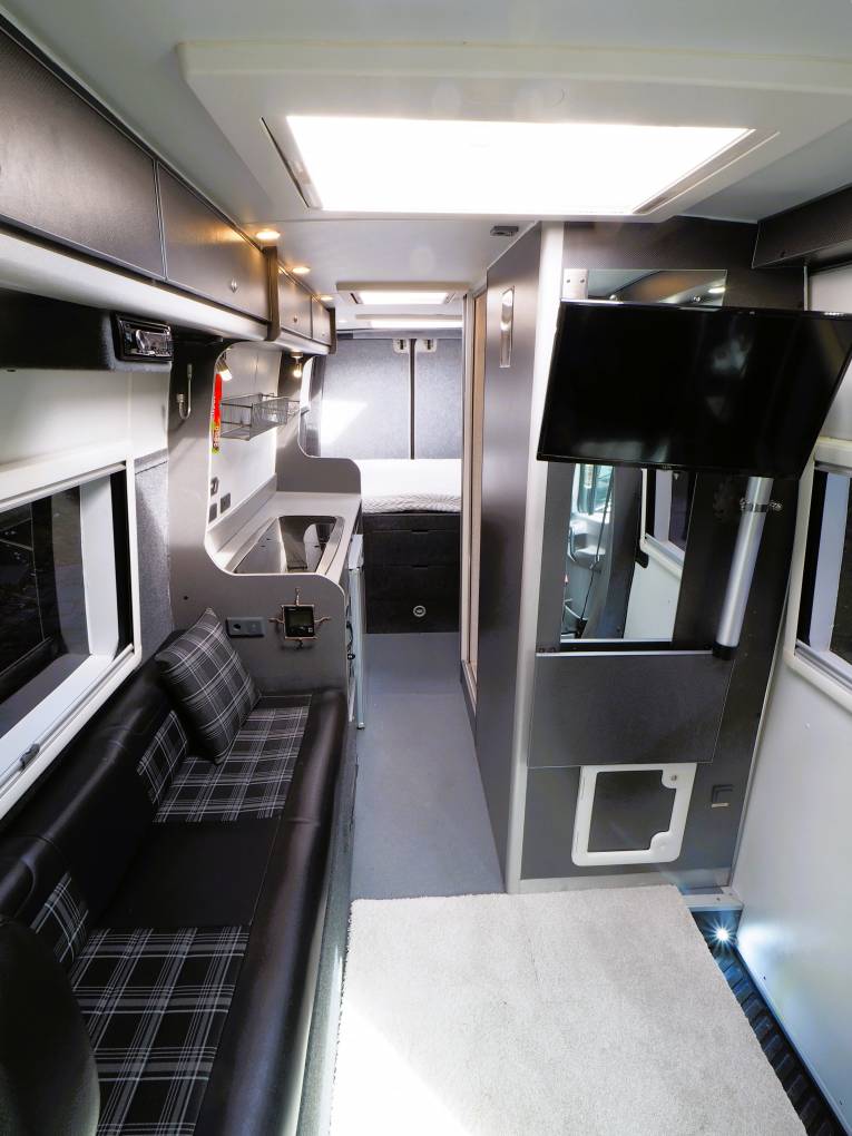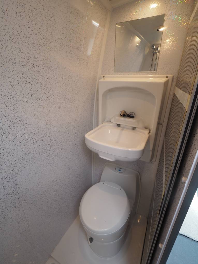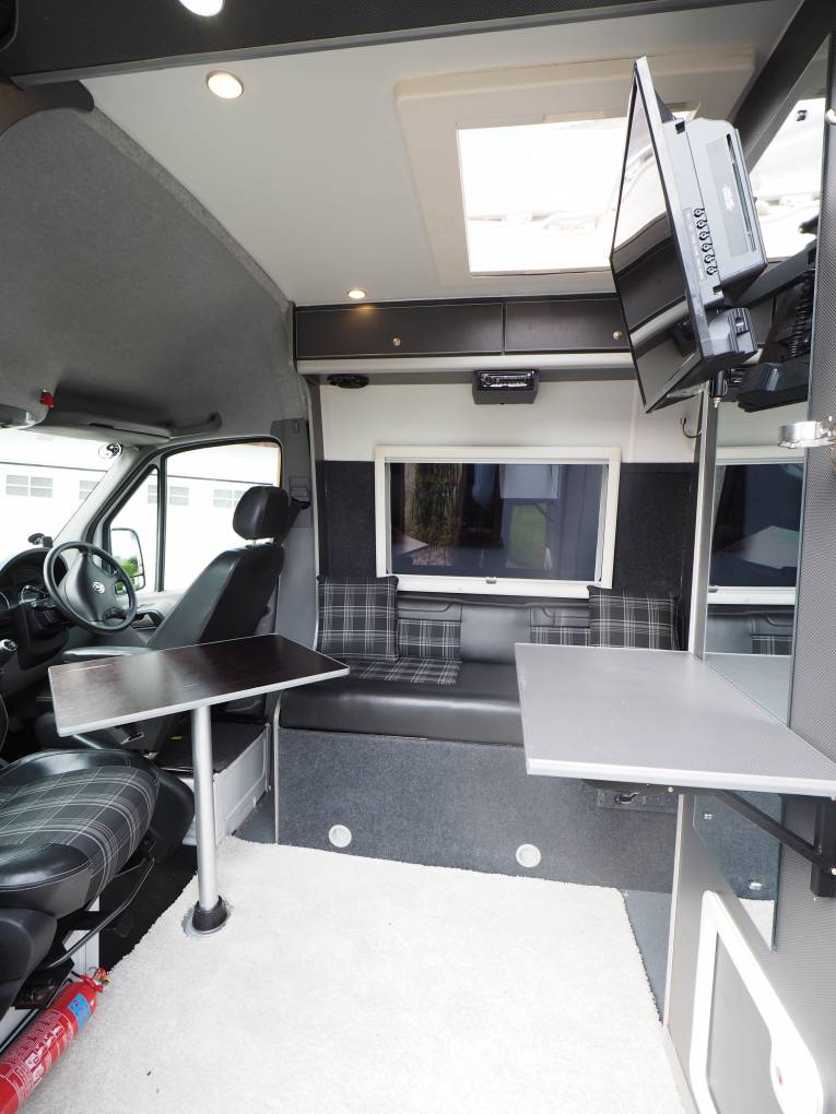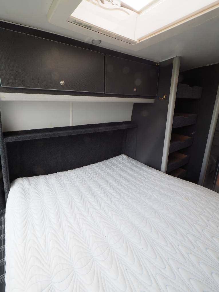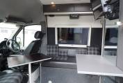 Rear fixed bed with garage space under, central kitchen with oven/grill, 2 burner gas hob and sink with hot and cold running water, and a private washroom with flushing cassette toilet, sink and shower. To the front there is a lounge area with side sofa, swivelling passenger front seat, lift up side table and drop in table to provide an area to dine, entertain or even work. A TV/DVD is included.