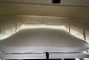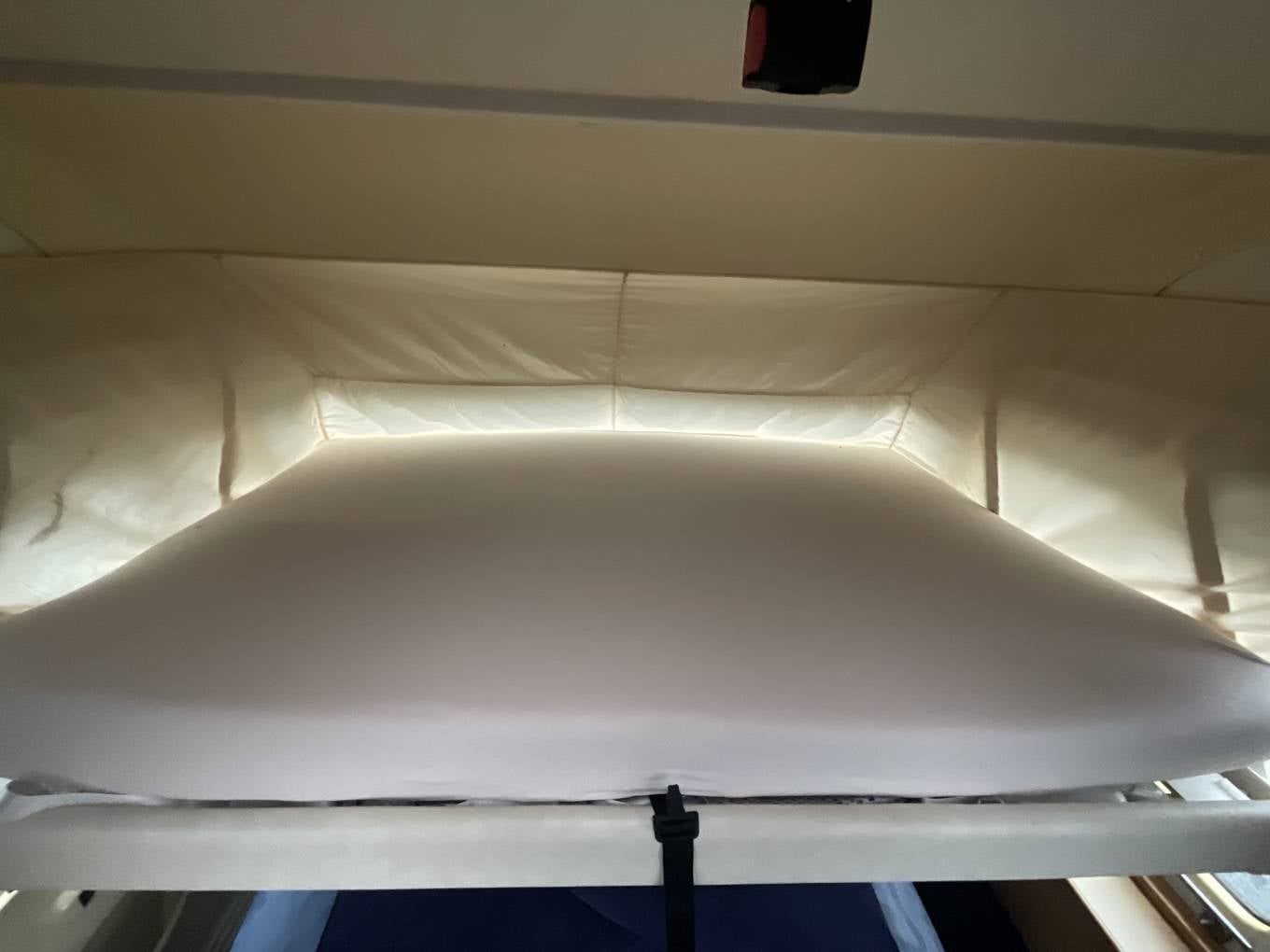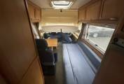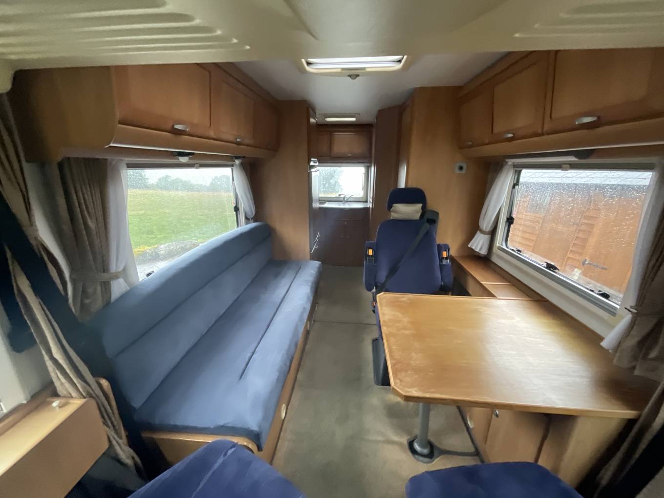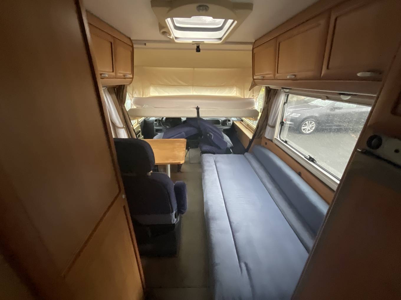 Lounge area has a 3 seater bench seat that will convert into a single bed. The forward facing captains chair has a 3 point seat belt and the front captains chairs swivel round to comfortably seat up to 6 people. Drop down large double bed above the cab will accomodate 2 people.