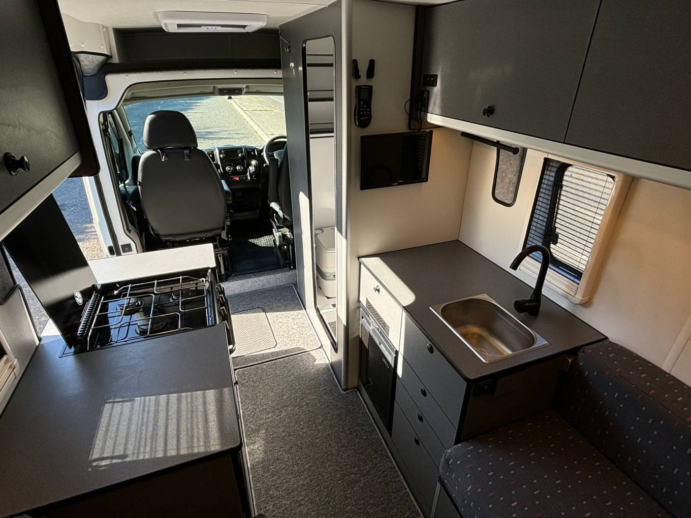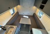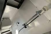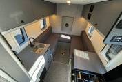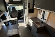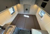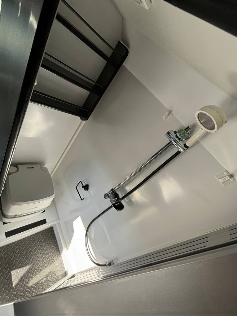 enhance the open feeling in the van. The washroom has a standing shower head