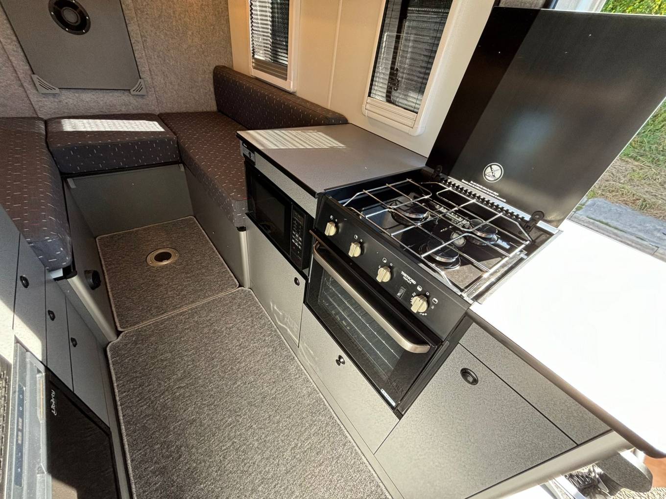 The kitchen offers a 12v fridge,