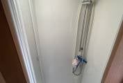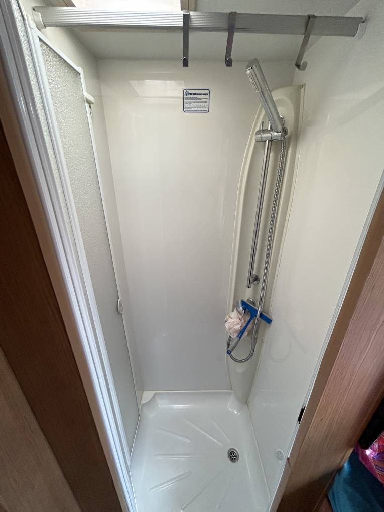 The washroom has a separate shower with perspex screen doors, a Thetford cassette toilet with electric flush, a wash basin and mixer tap, a bathroom cabinet for your toiletries and a large mirror.