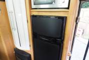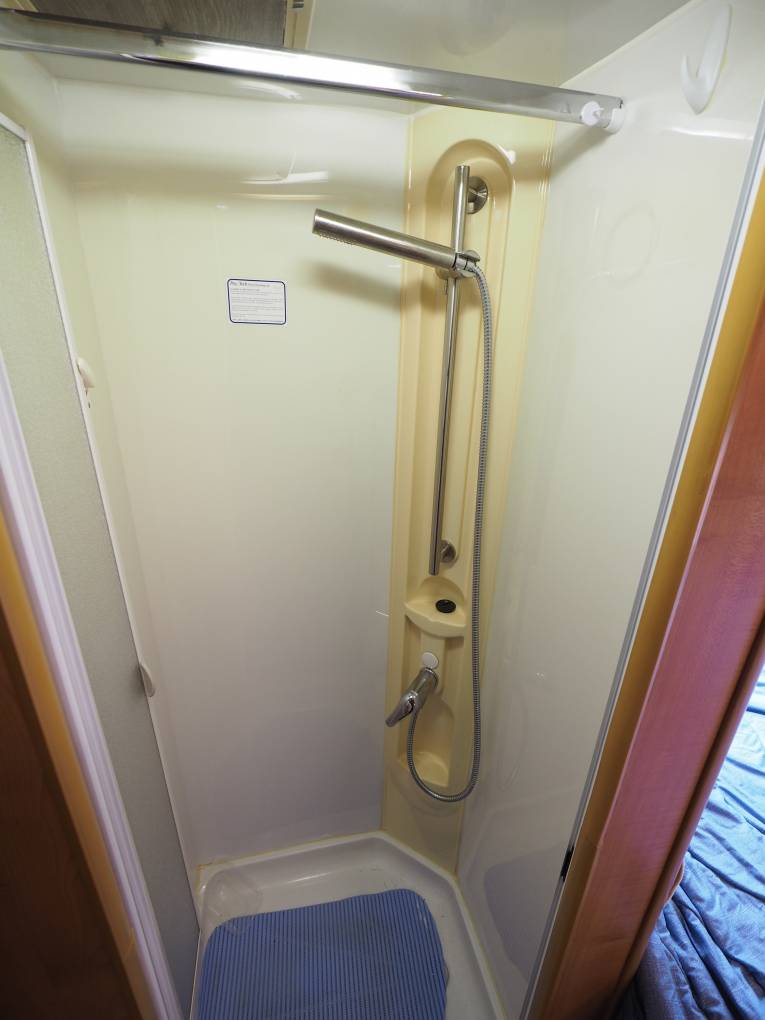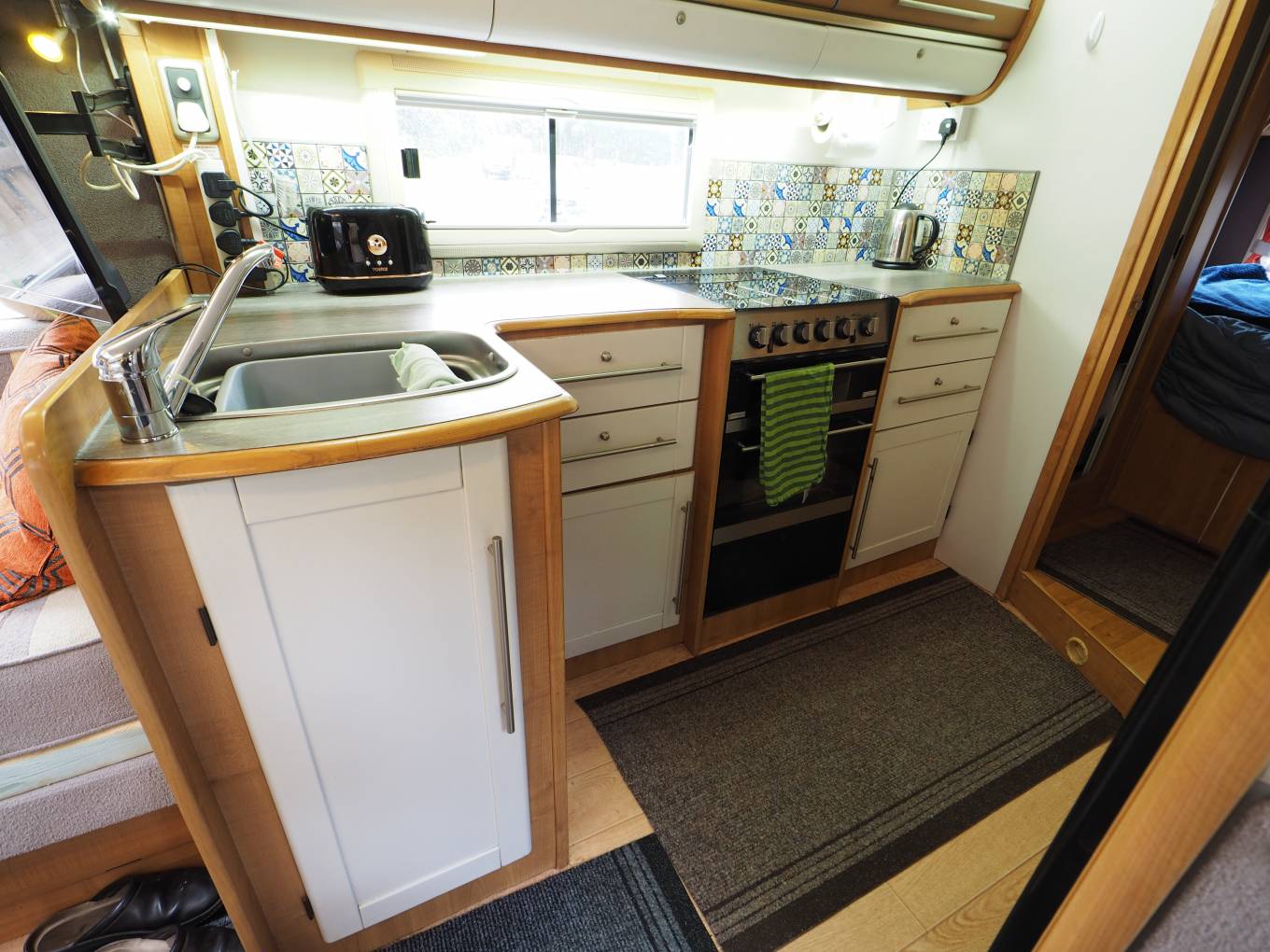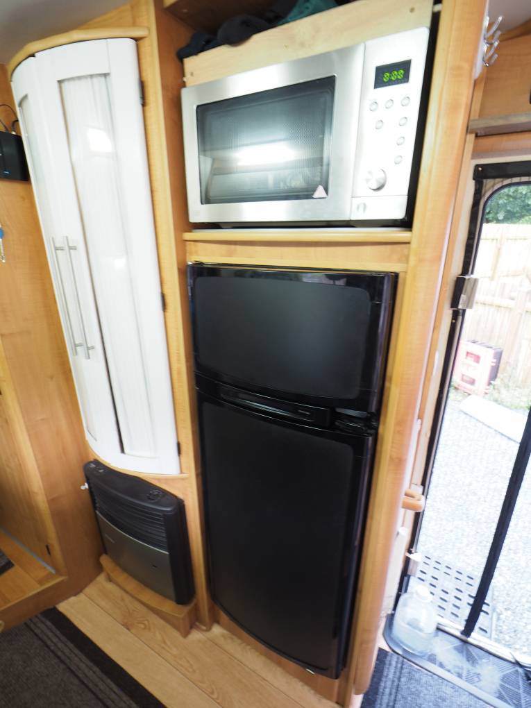 A rear fixed transverse bed sits above a large garage below and there is plenty of lighting and cupboard space surrounding the bed. The washroom is split either side of the motorhome with a flushing cassette toilet, sink and vanity unit to one side and a separate shower cubicle to the other. A good sized kitchen comprises a duel fuel hob with 3-gas burners and an electric hotplate, an oven and grill, sink with mixer tap and plenty of storage and food prep space. Opposite is a large fridge (new in 2019) with a separate freezer compartment, and a microwave oven.